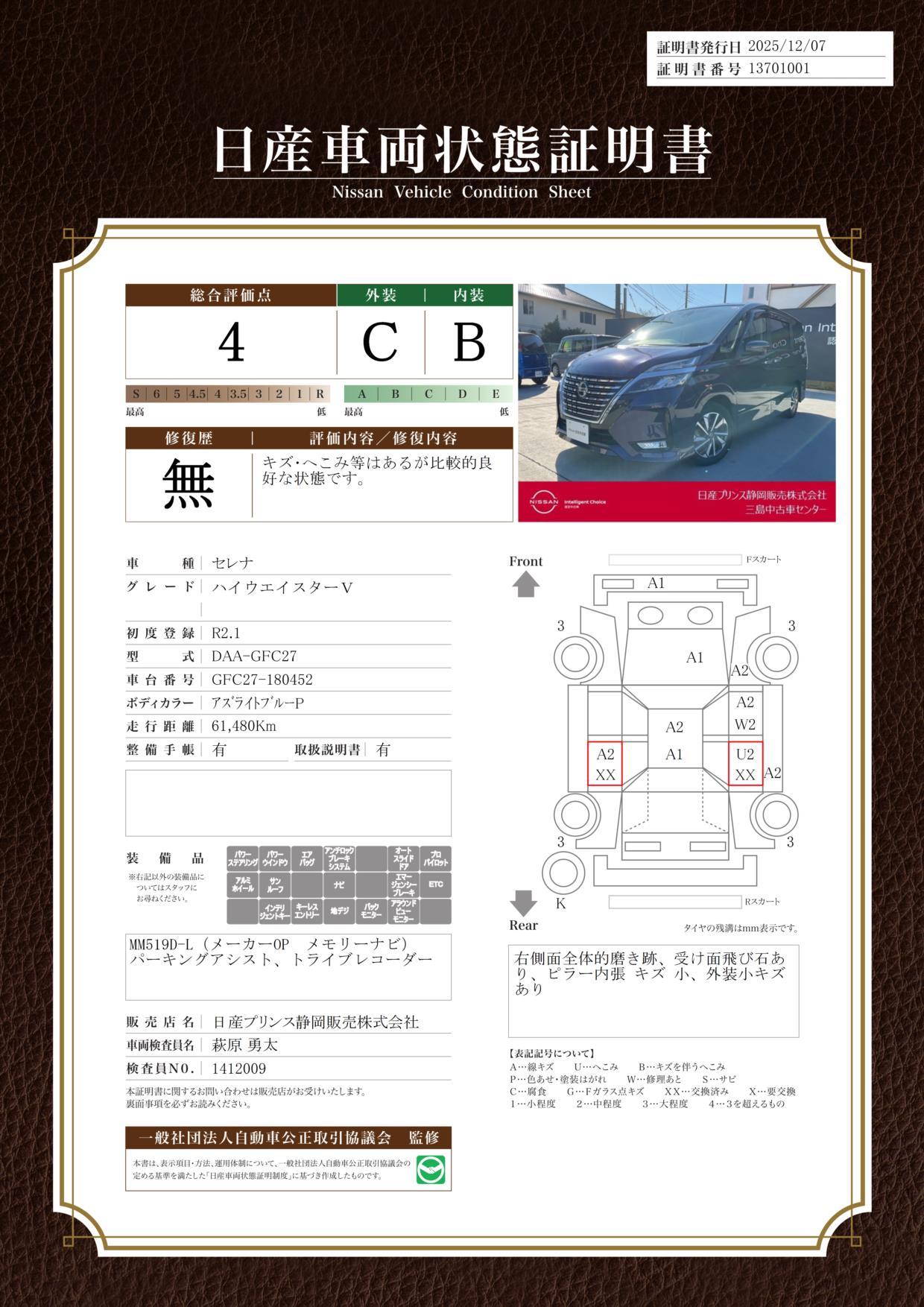• また、修復歴・法定整備・保証の有無ならびに詳細内容につきましても、必ず各販売店にご確認いただきますようお願いいたします。