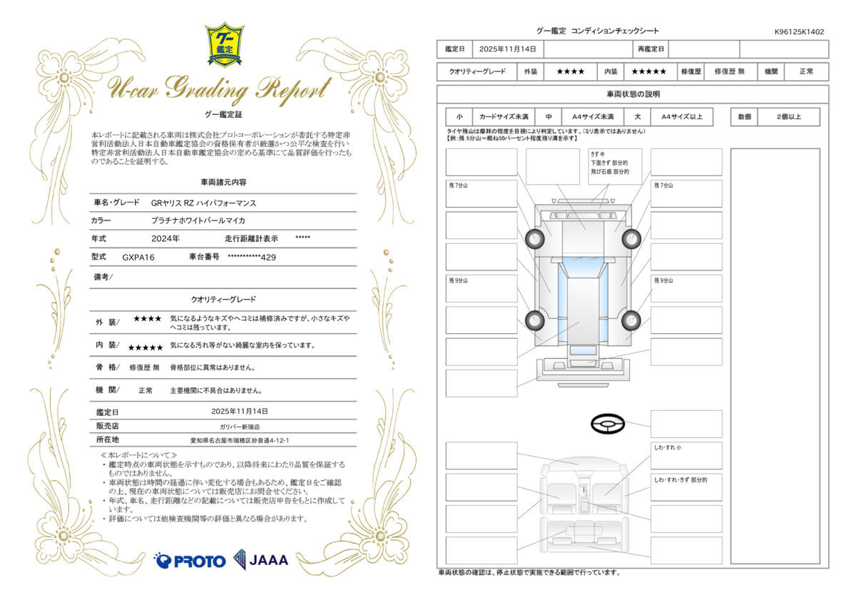 | 保証修理受付先 | ●当店までご連絡ください。ご遠方の方は当店で受付後、お近くのガリバー店舗または修理工場のご案内をいたしますので、お気軽にお申し付けください。 |