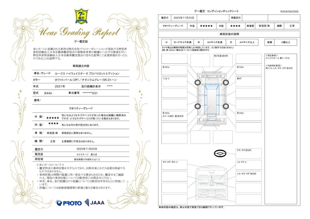 | 保証項目 | 3ヶ月・3000km以内ならエンジン、トランスミッション、ハイブリッド、ステアリング、ブレーキの各機構における主要項目を無償修理(または交換)いたします。 |