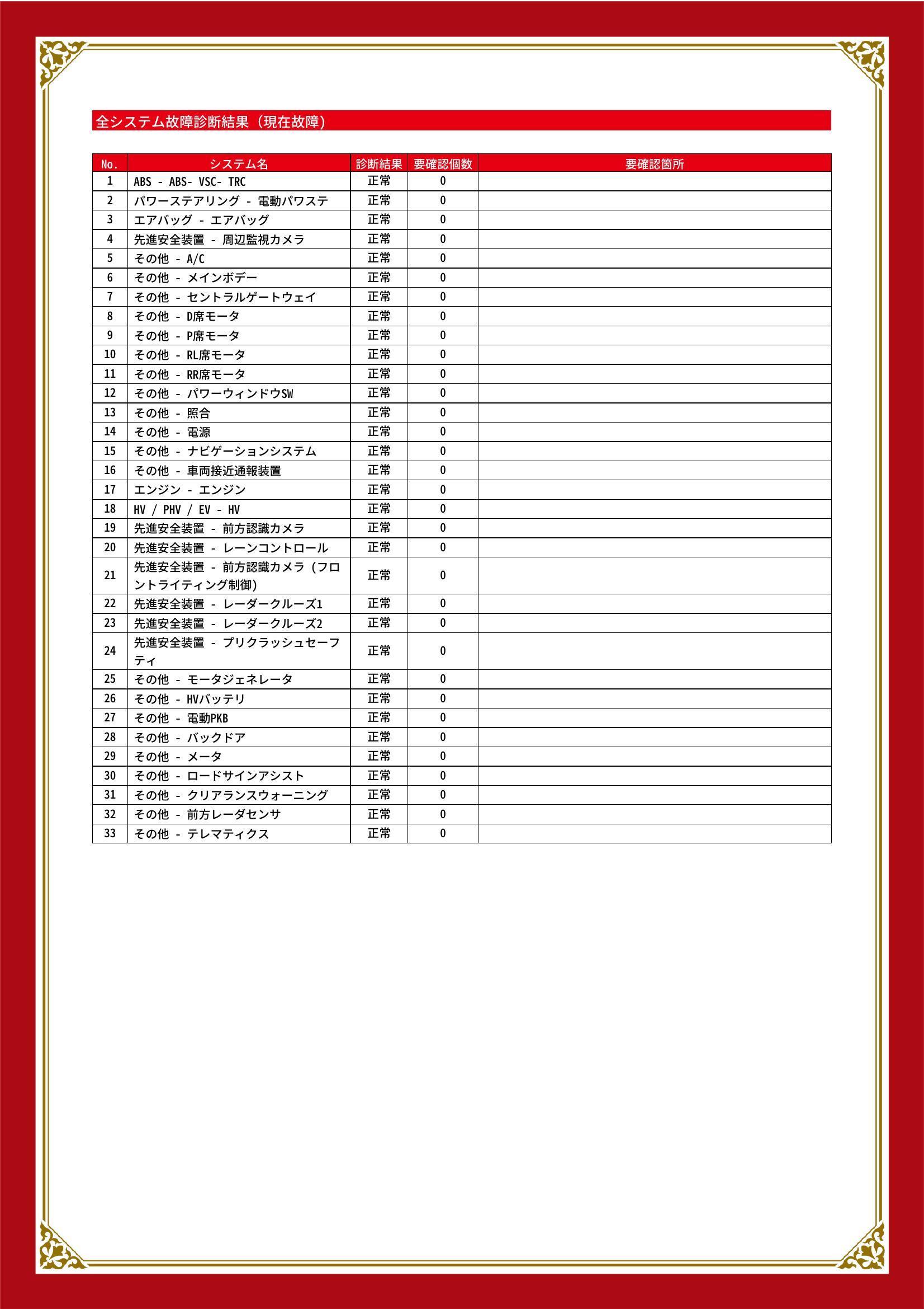 | 保証項目 | 3ヶ月・3000km以内ならエンジン、トランスミッション、ハイブリッド、ステアリング、ブレーキの各機構における主要項目を無償修理(または交換)いたします。 |