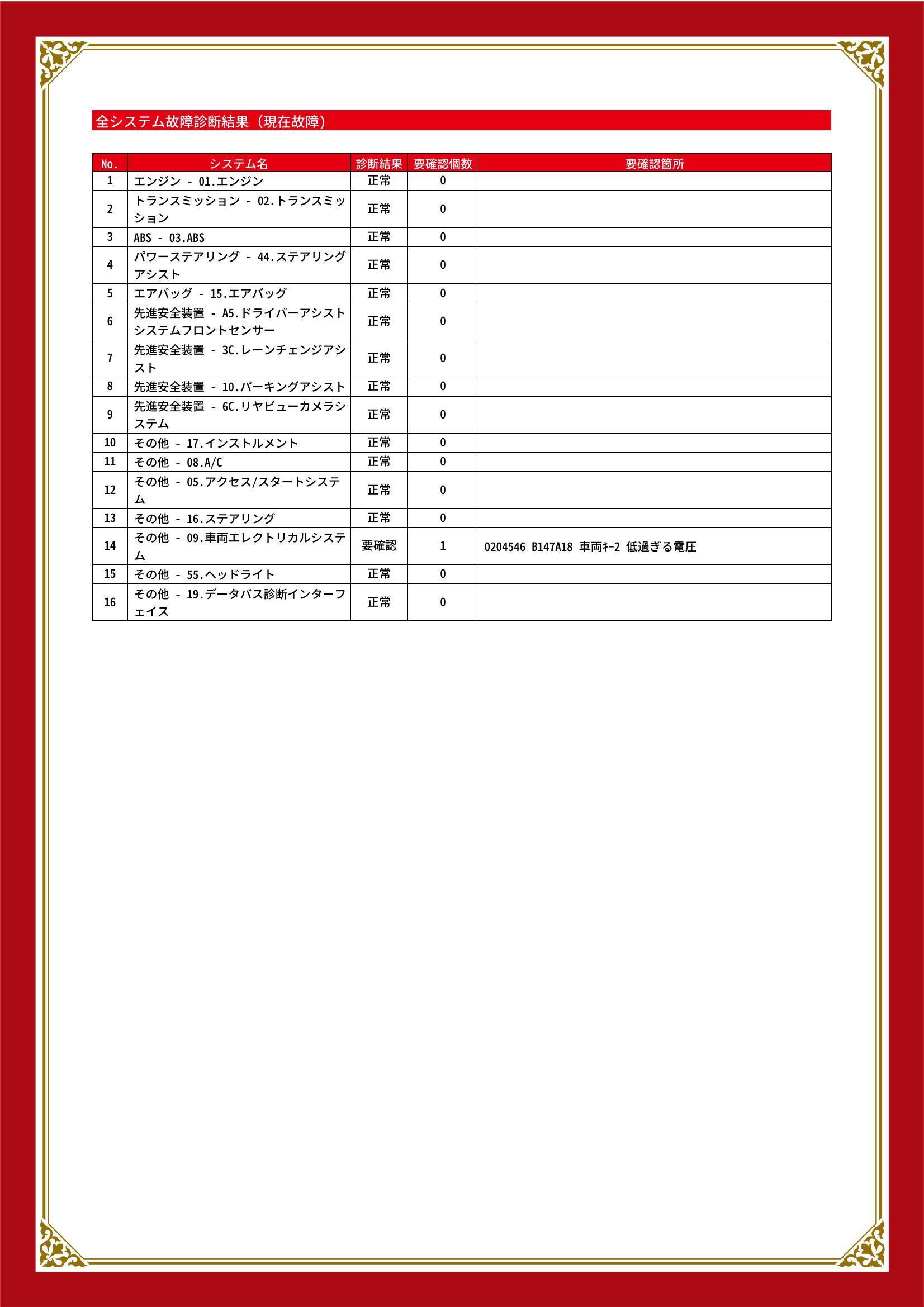 | 保証項目 | ■消耗品、油脂類、外装は保証対象外 全ての消耗部品の補充、交換に要する費用(例:ベルト類、ブレーキディスク・パッド、電球の交換等)は保証修理に含まれません |