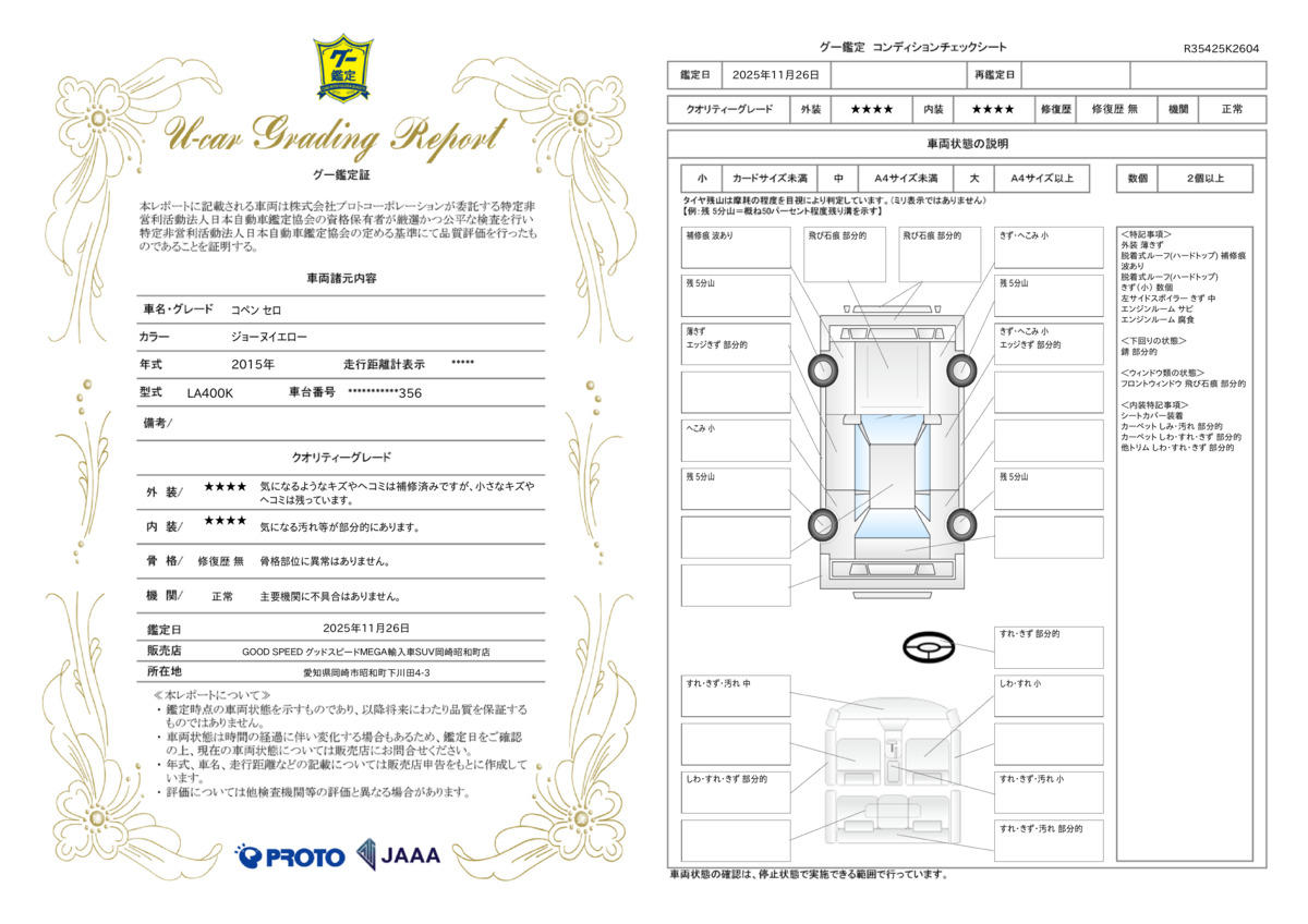 [保証付]:1ヶ月・1000km ※いずれか早い時期が保証適用の条件となります。 業界高水準、最長保証期間はなんと15年。保証項目406部位。任意による1年毎の更新が可能な新しいアフターサービス「GOOD SPEEDオリジナル プレミアムワランティー」をご用意させて頂いております。 |