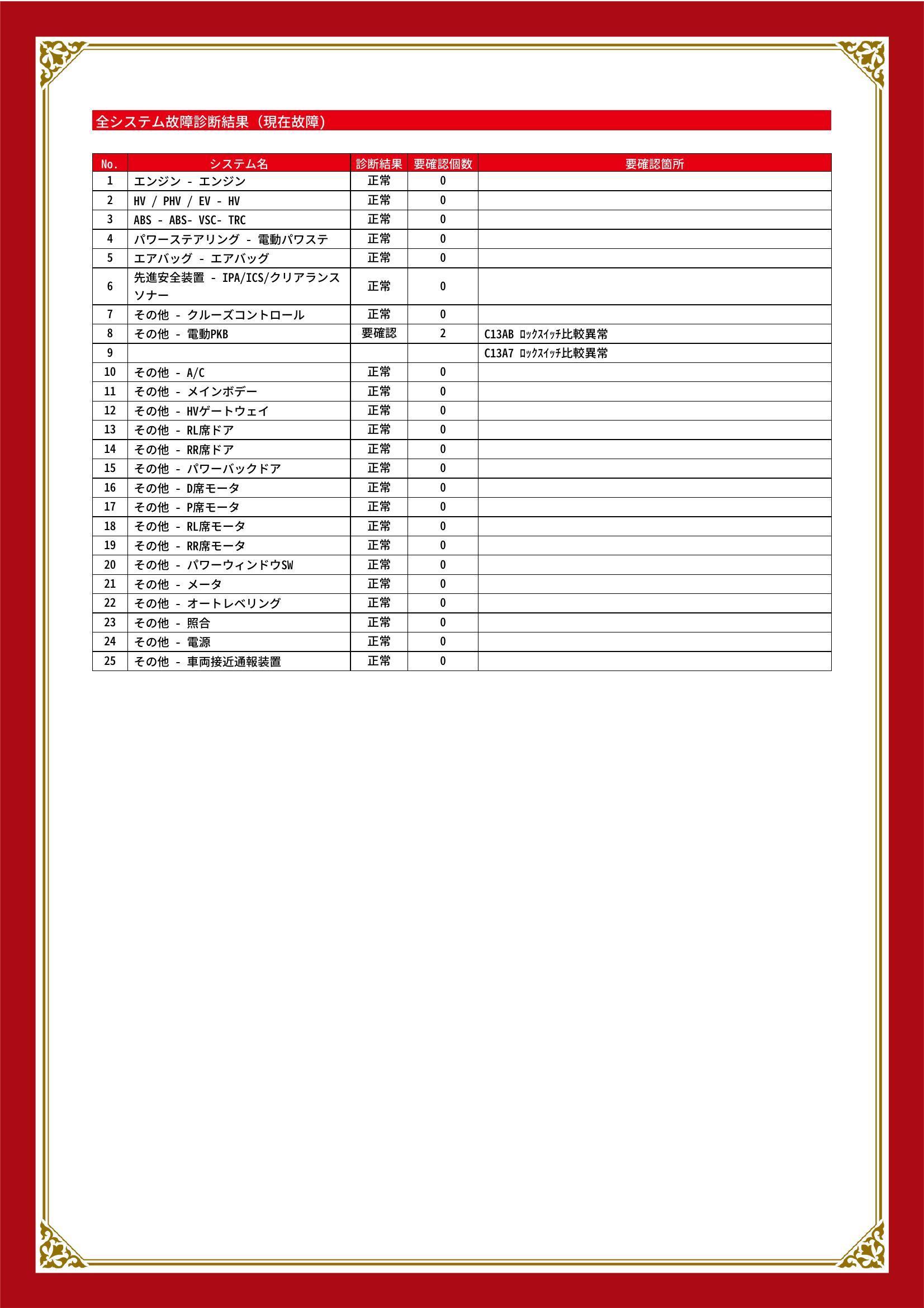 | 保証項目 | その他、スタンダード・プラチナ保証をご用意。【スタンダード・プラチナ保証】では対象項目が業界最高水準の400部位以上!消耗品以外は保証にてご対応出来ます。詳細は店舗へお問い合わせください! |