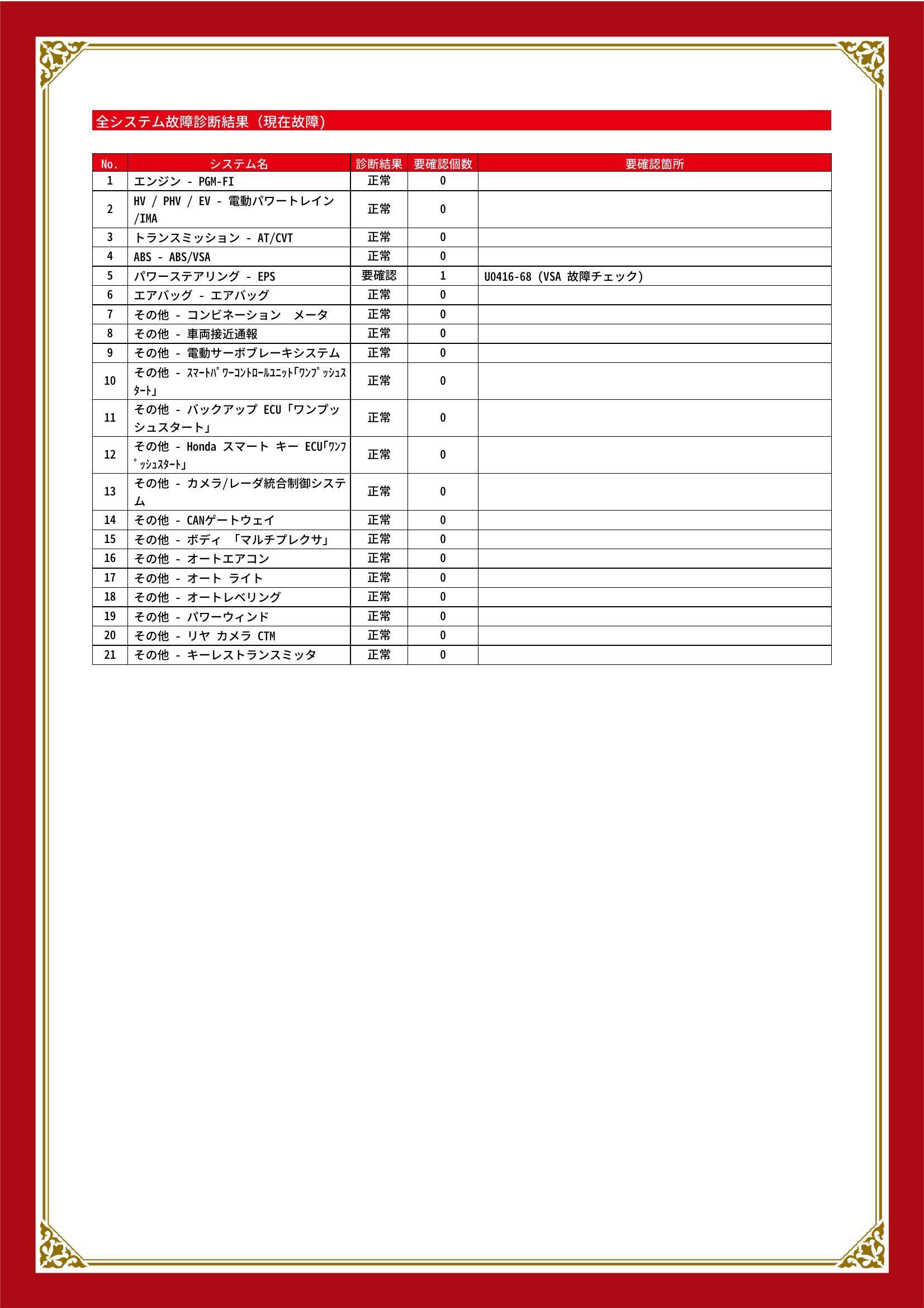 | 保証項目 | その他、スタンダード・プラチナ保証をご用意。【スタンダード・プラチナ保証】では対象項目が業界最高水準の400部位以上!消耗品以外は保証にてご対応出来ます。詳細は店舗へお問い合わせください! |