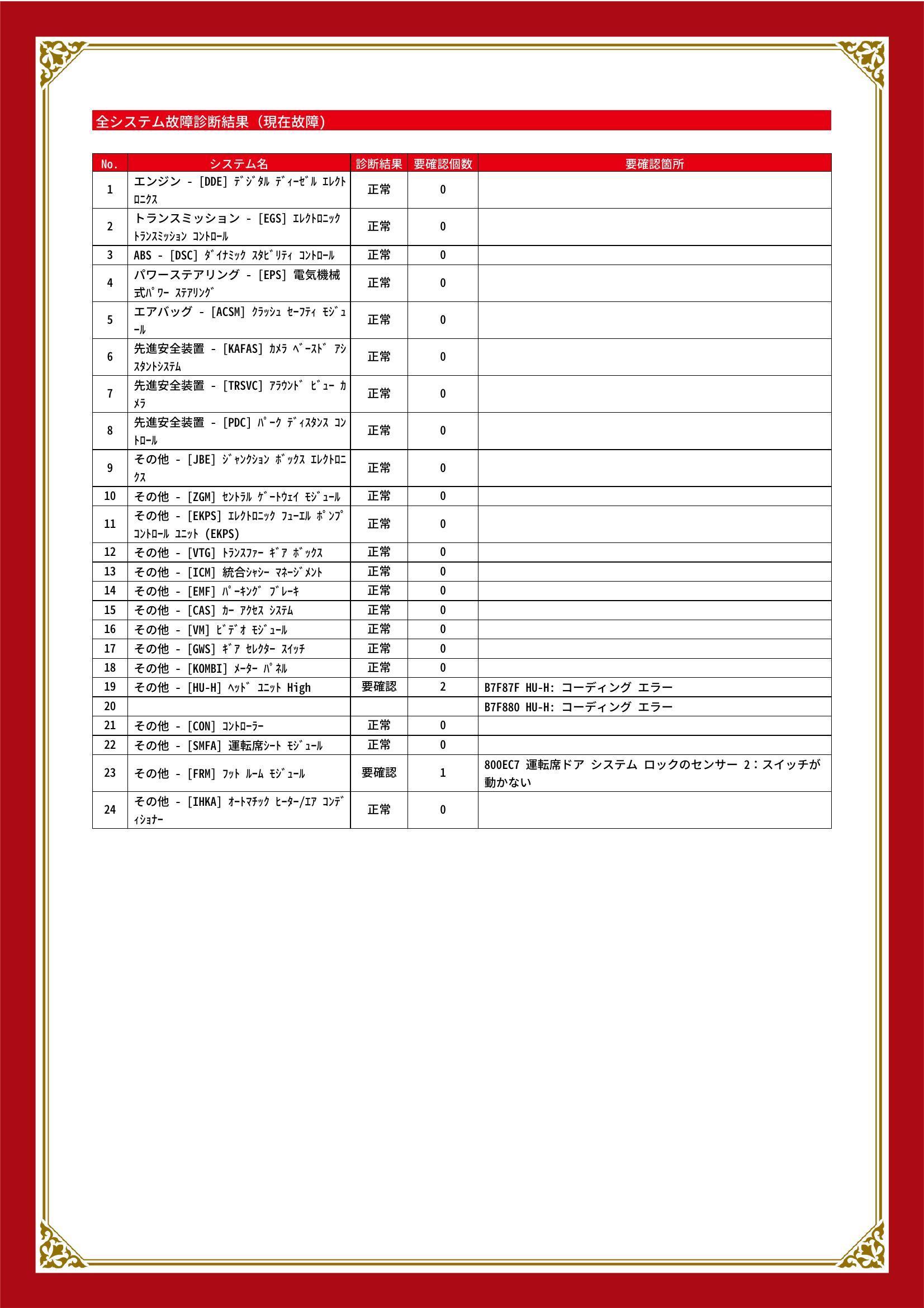 | 保証項目 | ■消耗品、油脂類、外装は保証対象外 全ての消耗部品の補充、交換に要する費用(例:ベルト類、ブレーキディスク・パッド、電球の交換等)は保証修理に含まれません |