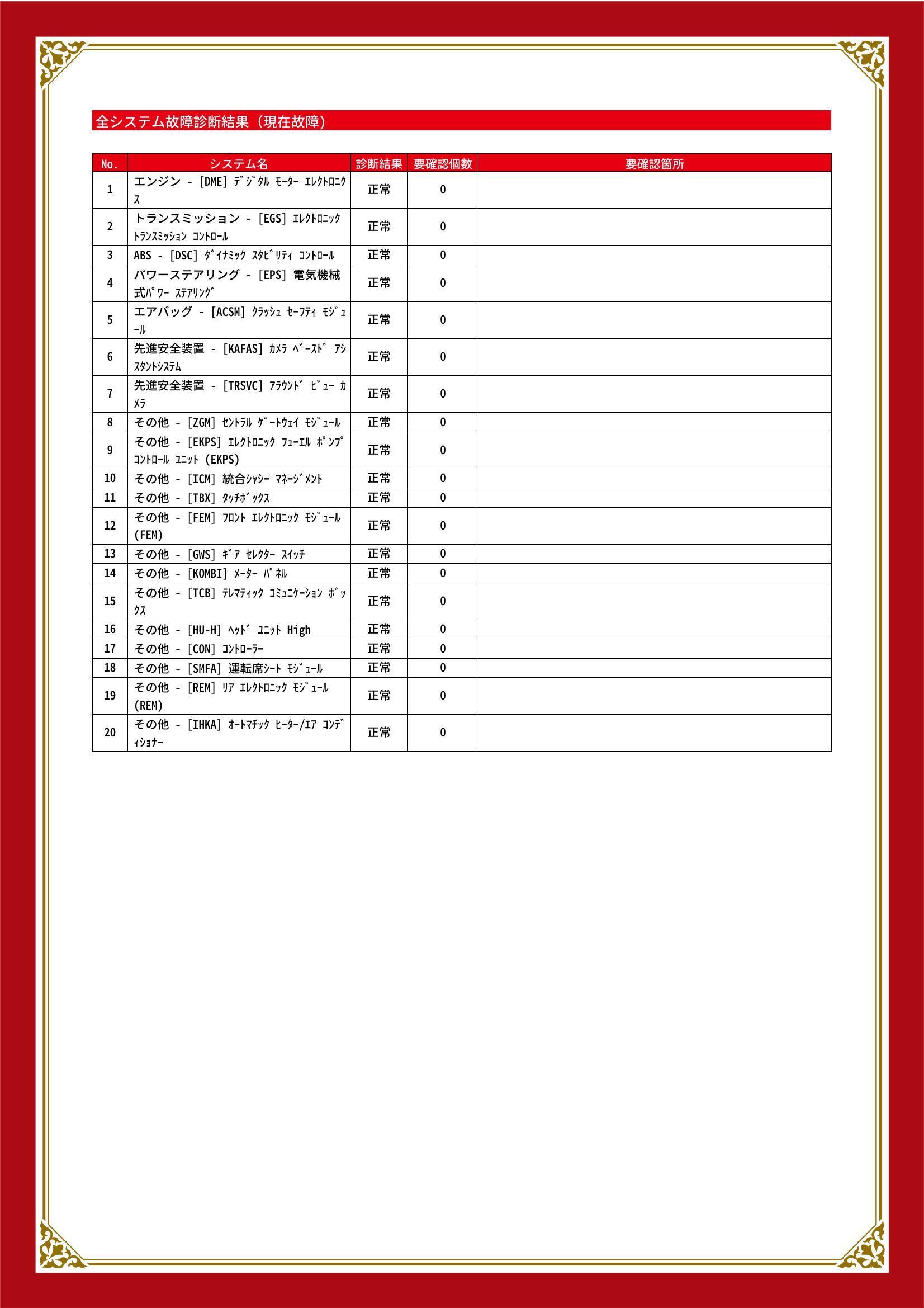 | 保証項目 | ■消耗品、油脂類、外装は保証対象外 全ての消耗部品の補充、交換に要する費用(例:ベルト類、ブレーキディスク・パッド、電球の交換等)は保証修理に含まれません |
