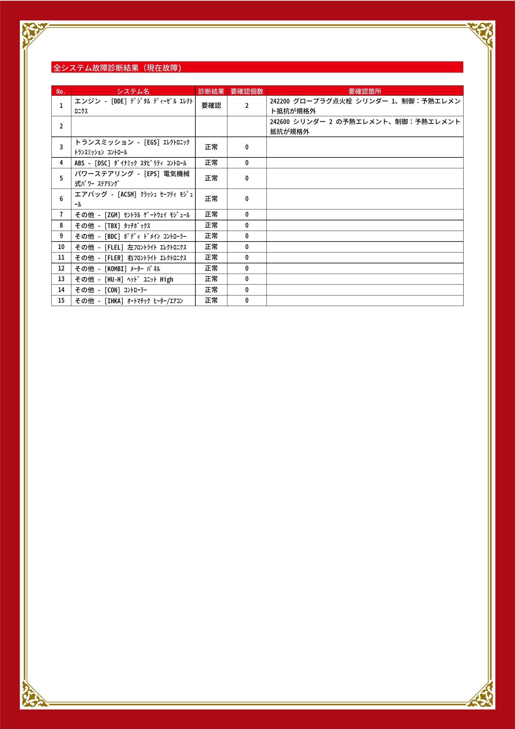 | 保証項目 | ■消耗品、油脂類、外装は保証対象外 全ての消耗部品の補充、交換に要する費用(例:ベルト類、ブレーキディスク・パッド、電球の交換等)は保証修理に含まれません |