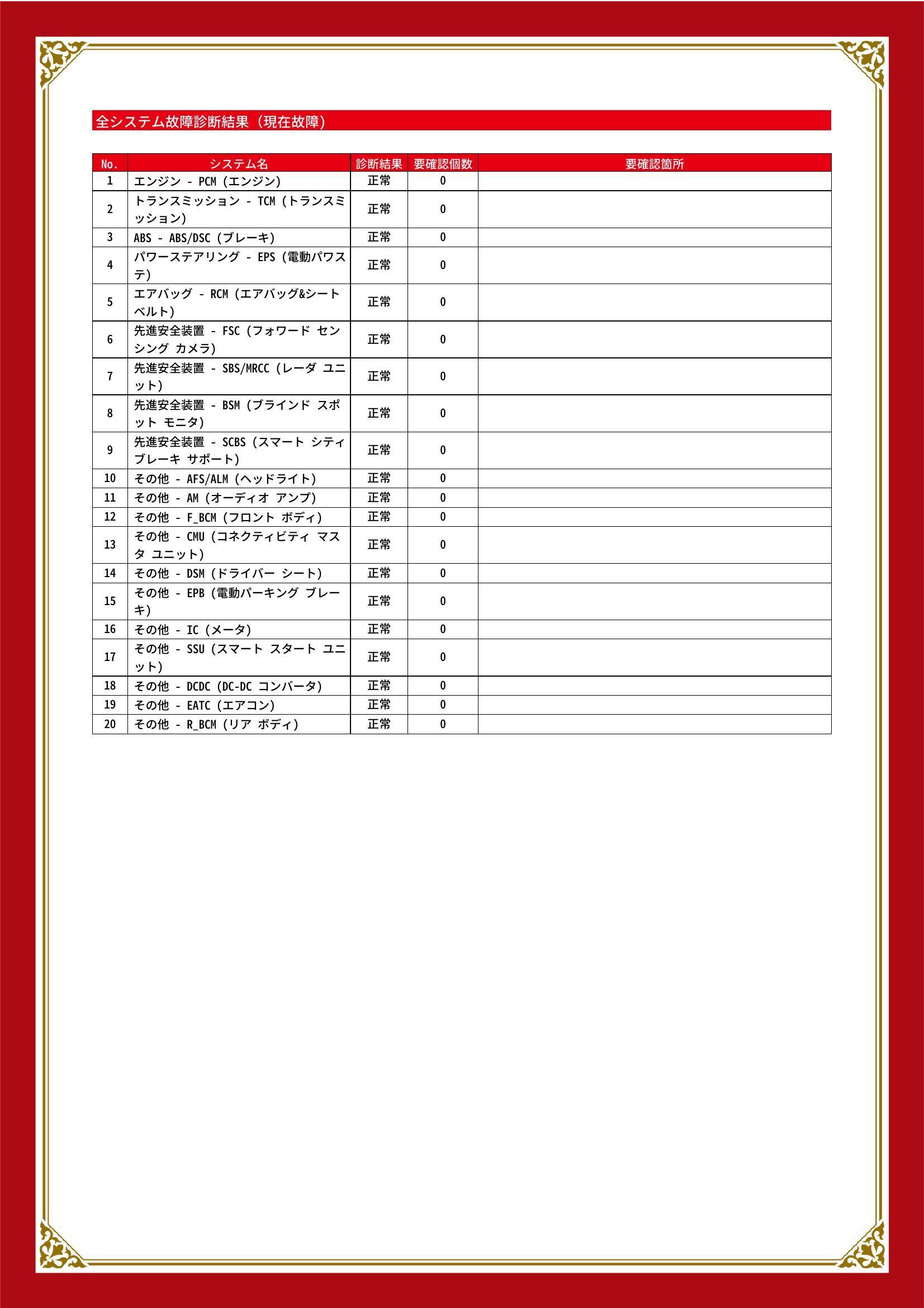 | 保証項目 | その他、スタンダード・プラチナ保証をご用意。【スタンダード・プラチナ保証】では対象項目が業界最高水準の400部位以上!消耗品以外は保証にてご対応出来ます。詳細は店舗へお問い合わせください! |