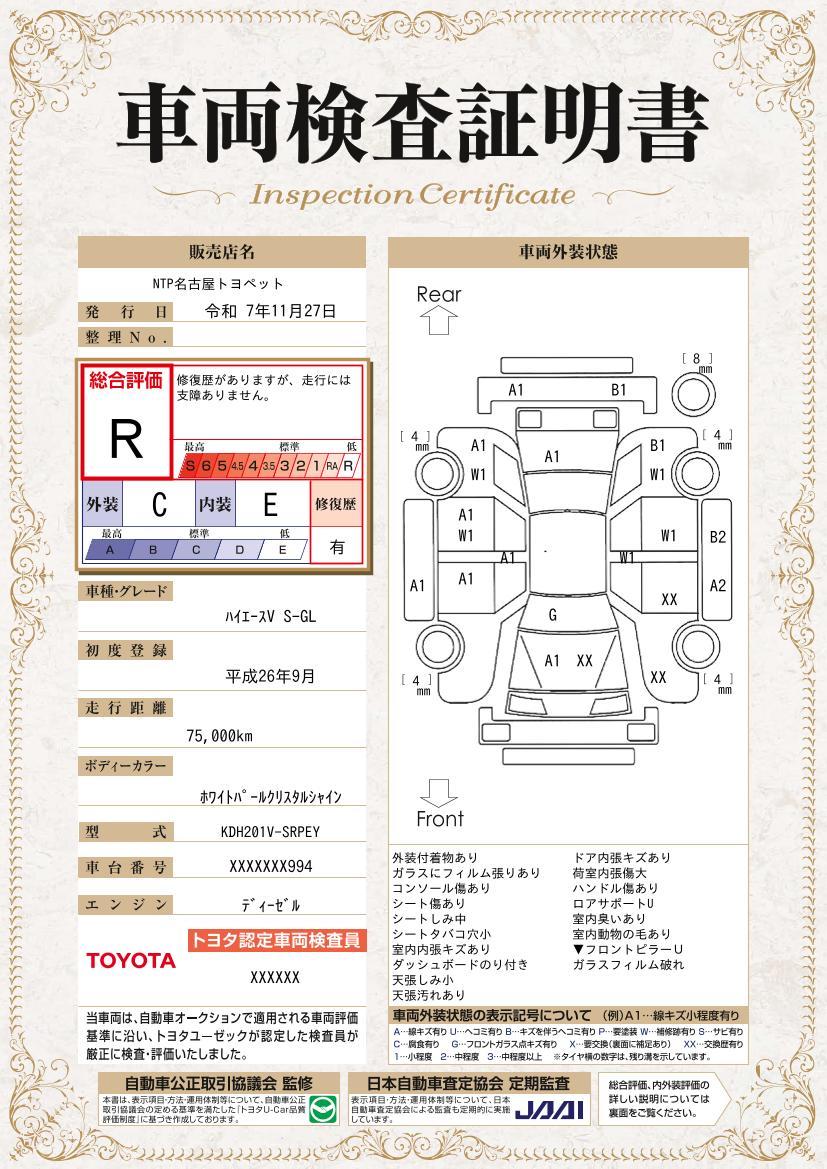 車両検査証明書はクルマの状態を評価点と車両展開図で表示しています。