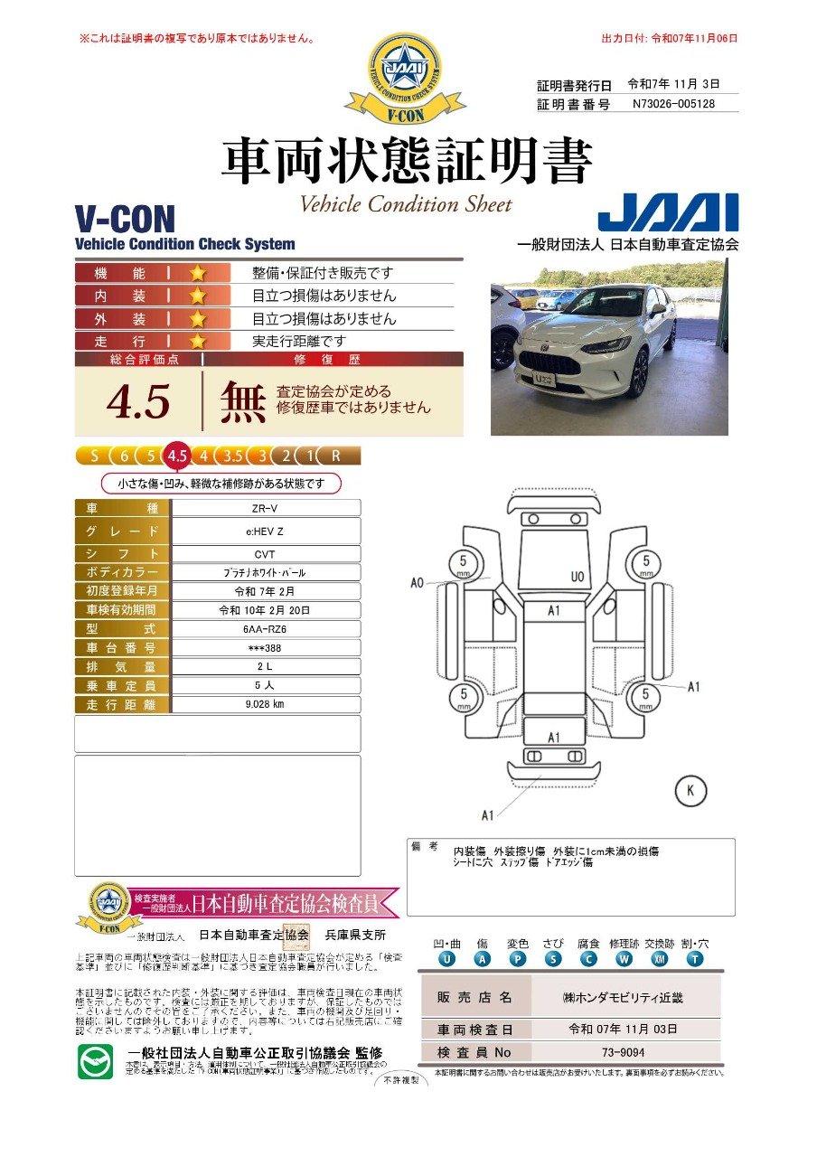 弊社試乗車R7年車両状態証明書4.5点のZR−V入庫 当店で大切に使用していました良質なZR−V4WDの試乗車を商品化! 1