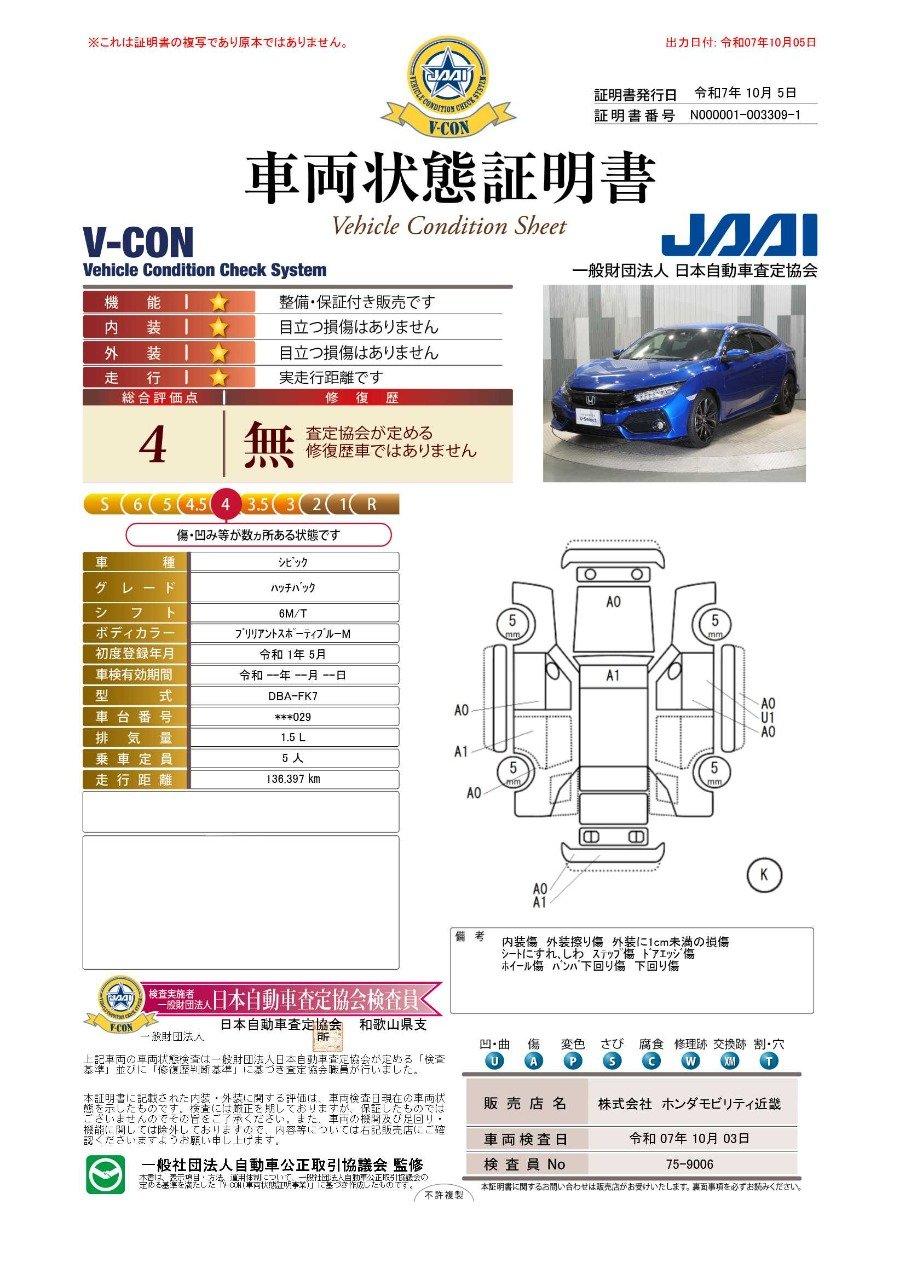 シビック ハッチバック 禁煙車 いまコレ+ 純正メモリーナビ 0703375A30251017W002 1