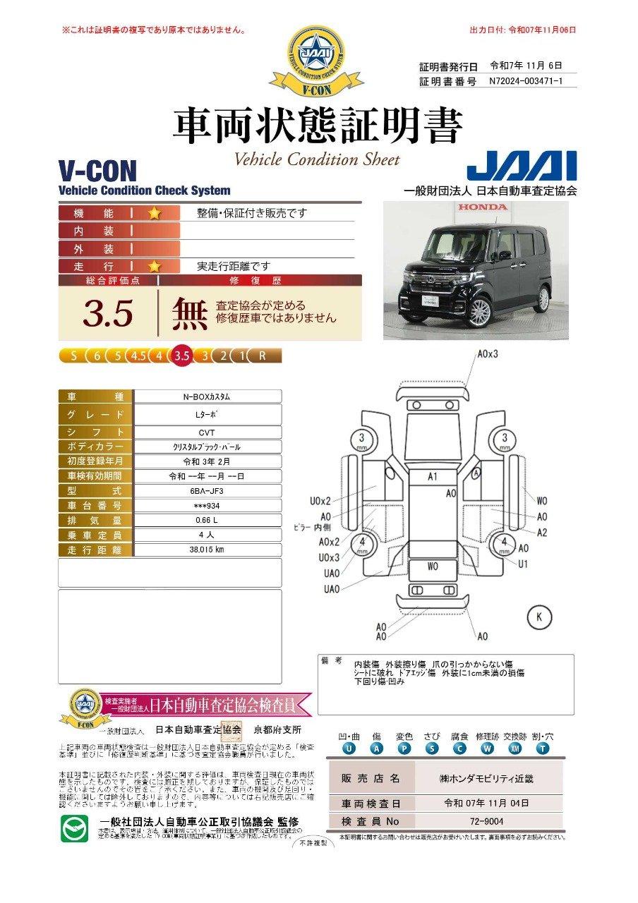 当店に並んでいる展示車には、日本査定協会発行の『車両状態証明書』をお付けしています。修復歴の有無はもちろん、車両状態図を見ながら実車でご確認いただけますのでより安心してご購入いただけます。 65