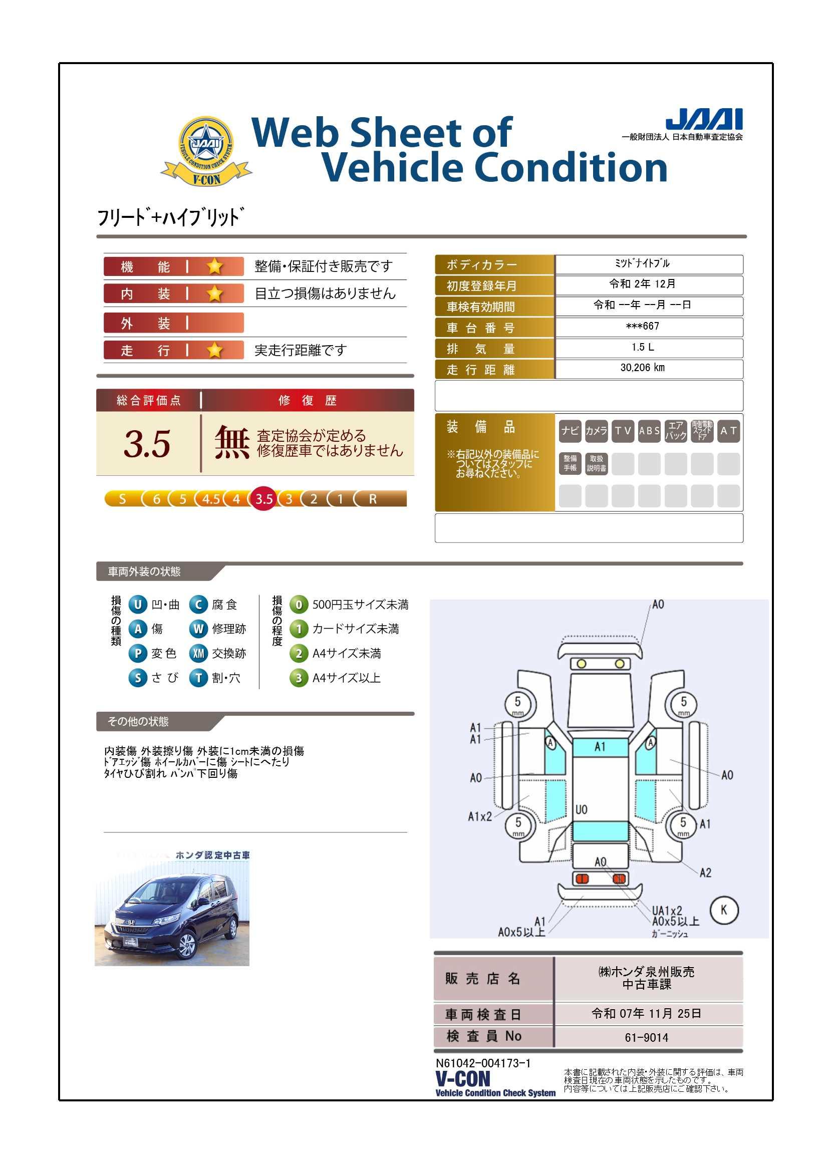 | 保証修理受付先 | 当店へご連絡下さい。当社または、お近くのホンダディーラーサービス工場をお手配いたします。ドライブ先で不具合が発生したり、住居が変わったりしても全国のホンダディーラーで変わらぬサービスをご提供します。 |