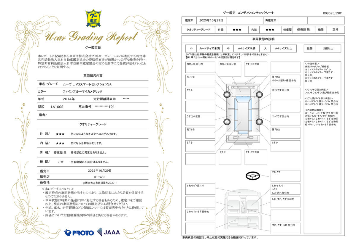 | 保証について | [保証付]:12ヶ月・10000km ※いずれか早い時期が保証適用の条件となります。 全車に無料保証を付帯しております。保証上限金額3万円の無料保証になります。無料保証だと不安な方にK−TAKEプレミア保証も御座います。全国のディーラー修理、遠方のお客様でもご安心頂けます。 |