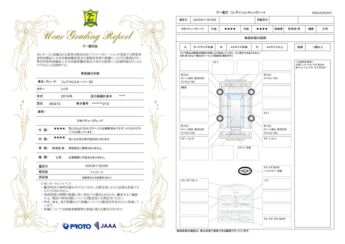 計52項目 エンジン関係、ステアリング機構、動力伝達機構/前後アクスル機構、ブレーキ機構の52項目を保証させていただきます。 |