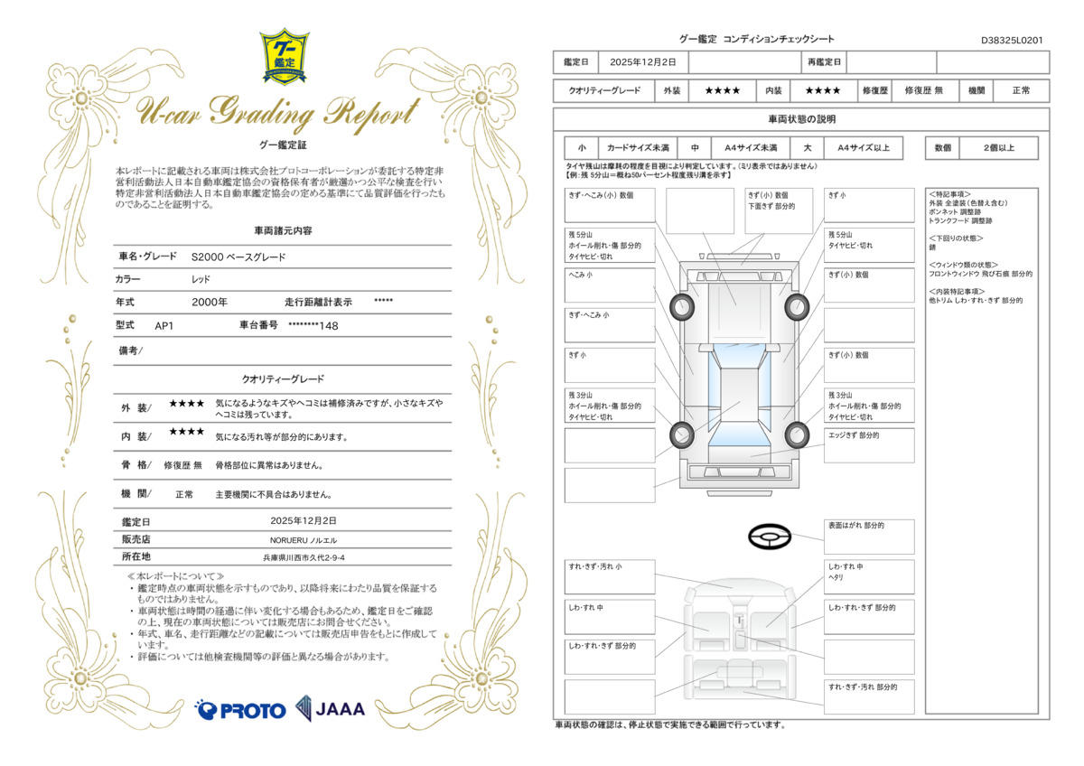 1第三者機関の日本自動車鑑定協会(JAAA)の鑑定師が中古車を鑑定。プロが一台一台チェックします。2外装・内装・機関・修復歴の4項目について鑑定を行っています。見た目からでは判断がつかない箇所も入念にチェックしています。3鑑定した外装、内装、機関、修復歴の鑑定証を発行。