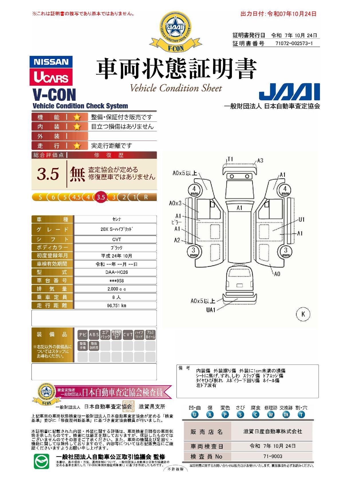 | 保証修理受付先 | 滋賀県内に認証指定工場を16ヶ所完備しています。アフターサービスもお任せ下さい。滋賀県外の方は全国2,000以上の日産サービス工場の中から利用も可能です。 |