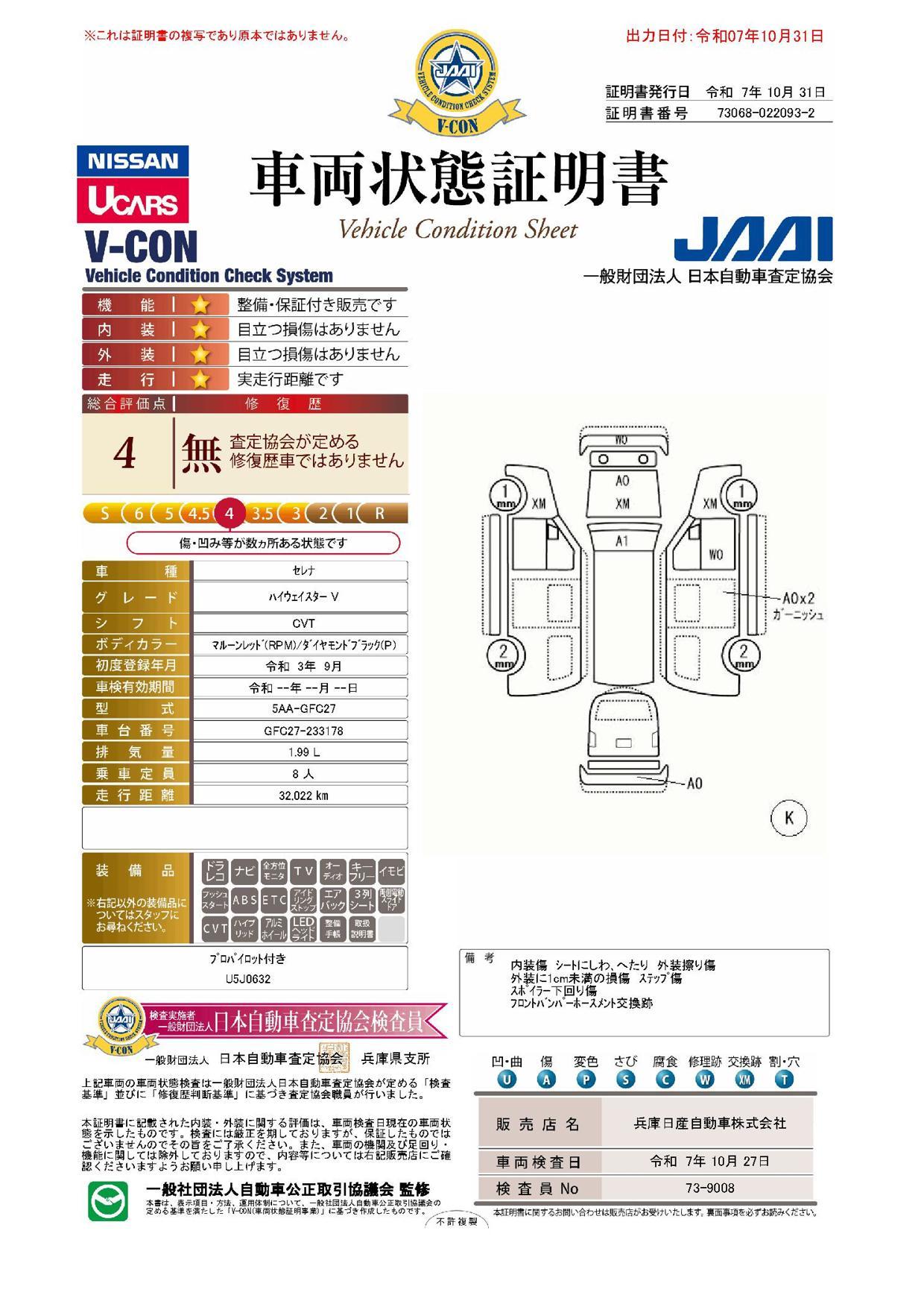 1年保証・走行距離無制限で全国約3.000箇所の日産サービス工場で対応できます。保証料追加でトータル3年まで延長できますので安心です。また納車後は1ヵ月無料点検付きなのでアフターサービスも万全です。