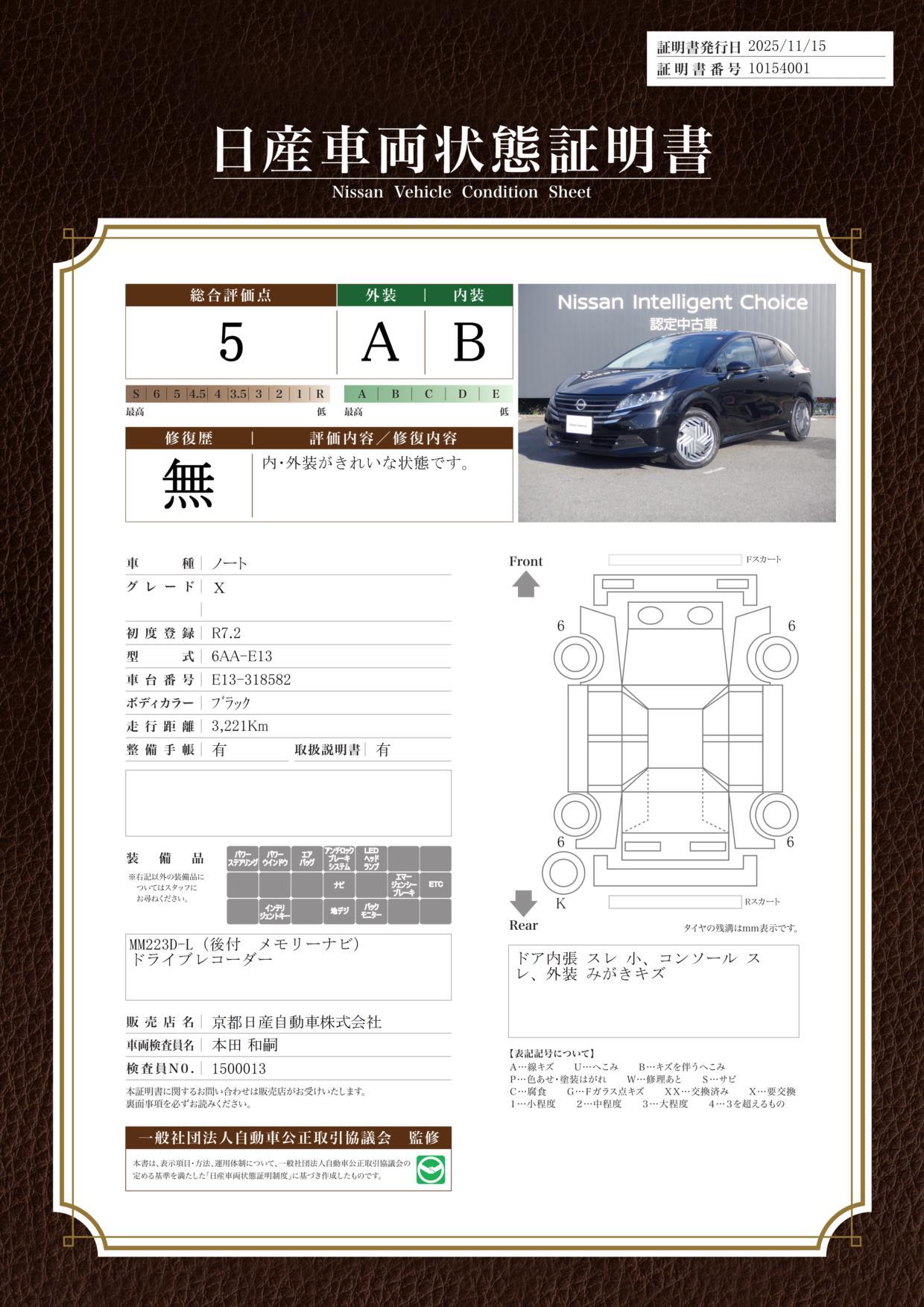 万が一の時に役立つ広視野角対応車室内カメラ搭載の日産純正ドライブレコーダーが装備されています。 10