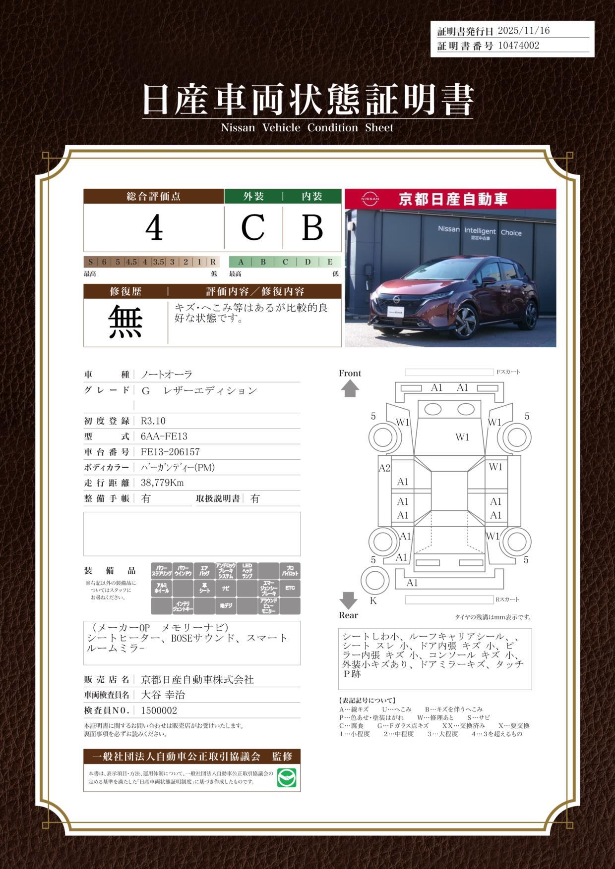 日産 オーラ 1.2 G レザーエディション プロパイロットシートヒーターNCナビ全方位 ワンオーナ 追突防止 レーダークルーズ 車線逸脱警報装置 LED 盗難防止 バックモニター ETC インテリジェントキー メモリーナビゲーション AW キーレスエントリー オートエアコン ABS