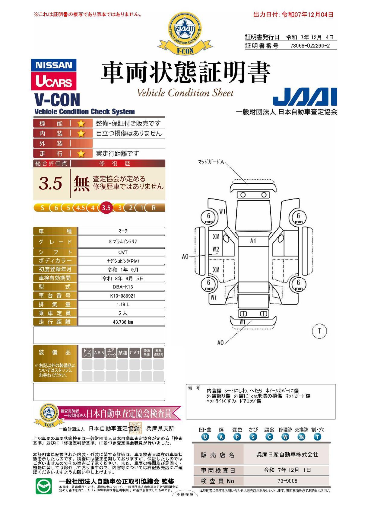 1年保証・走行距離無制限で全国約3.000箇所の日産サービス工場で対応できます。保証料追加でトータル3年まで延長できますので安心です。また納車後は1ヵ月無料点検付きなのでアフターサービスも万全です。