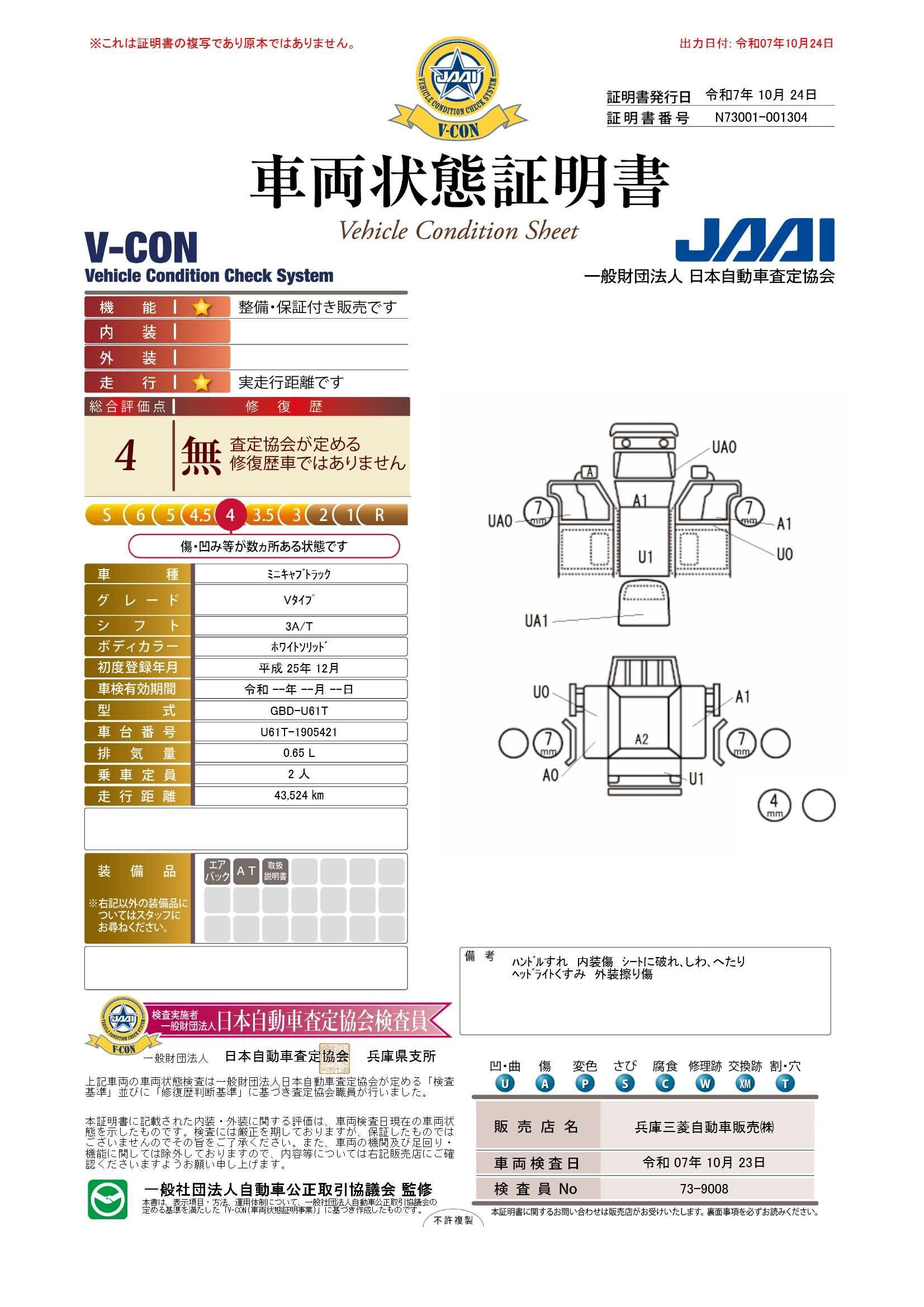 | 保証について | [保証付]:12ヶ月・走行無制限 三菱認定中古車保証12か月間走行無制限保証(エアコン・オーディオも保証対象です!!!)(認定中古車保証はオプションにて最長36か月走行無制限に延長可) |