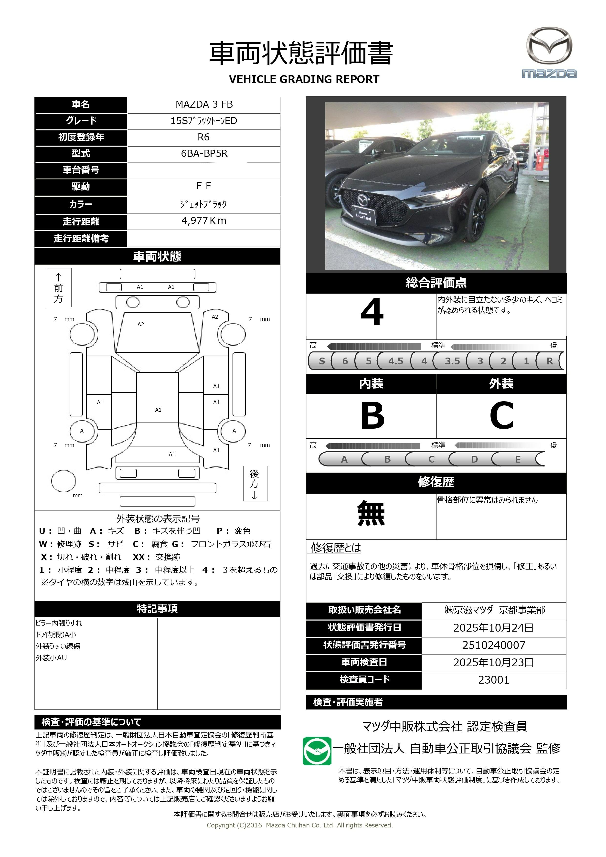 | 保証修理受付先 | 先ずは当店にご連絡ください。全国約800か所のマツダサービス工場で保証修理が可能ですので、旅先やお引越し先でのトラブルもご安心下さい。※マツダブランド車以外は当社のみ対応可能。詳しくはスタッフまで。 |