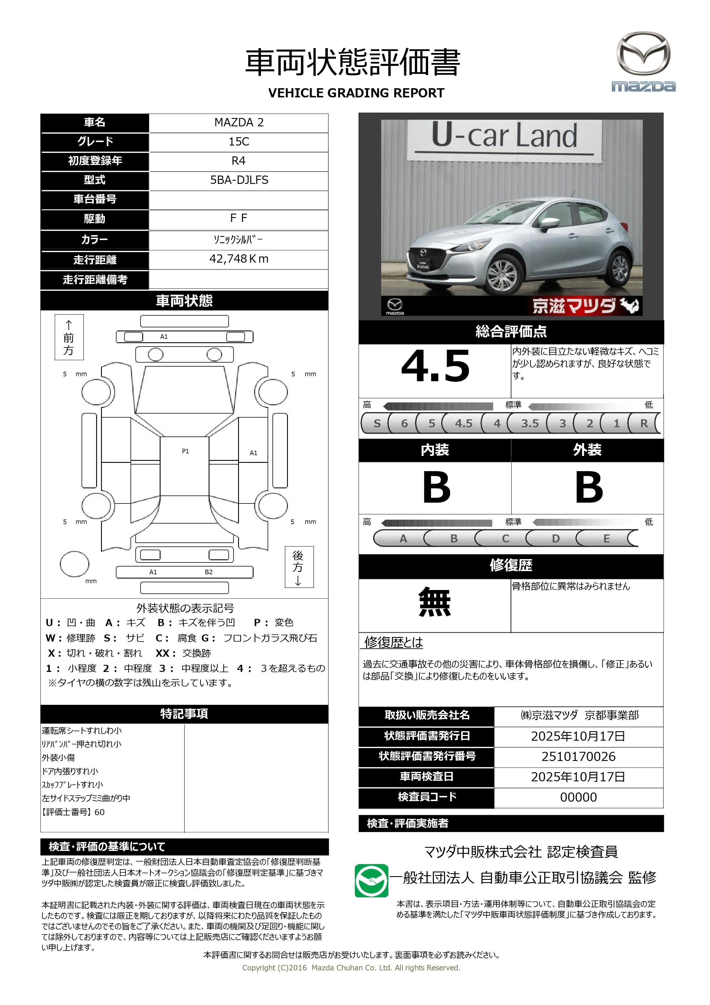 | 保証について | [保証付]:12ヶ月・走行無制限 マツダの店舗にてご購入頂いたお車に、無料でご提供している納車日より1年間・走行無制限の〔さわやか保証〕が付いております。別途有償で〔さわやかプラス〕にご加入頂くと、最大3年間の保証サービスが可能です。 |