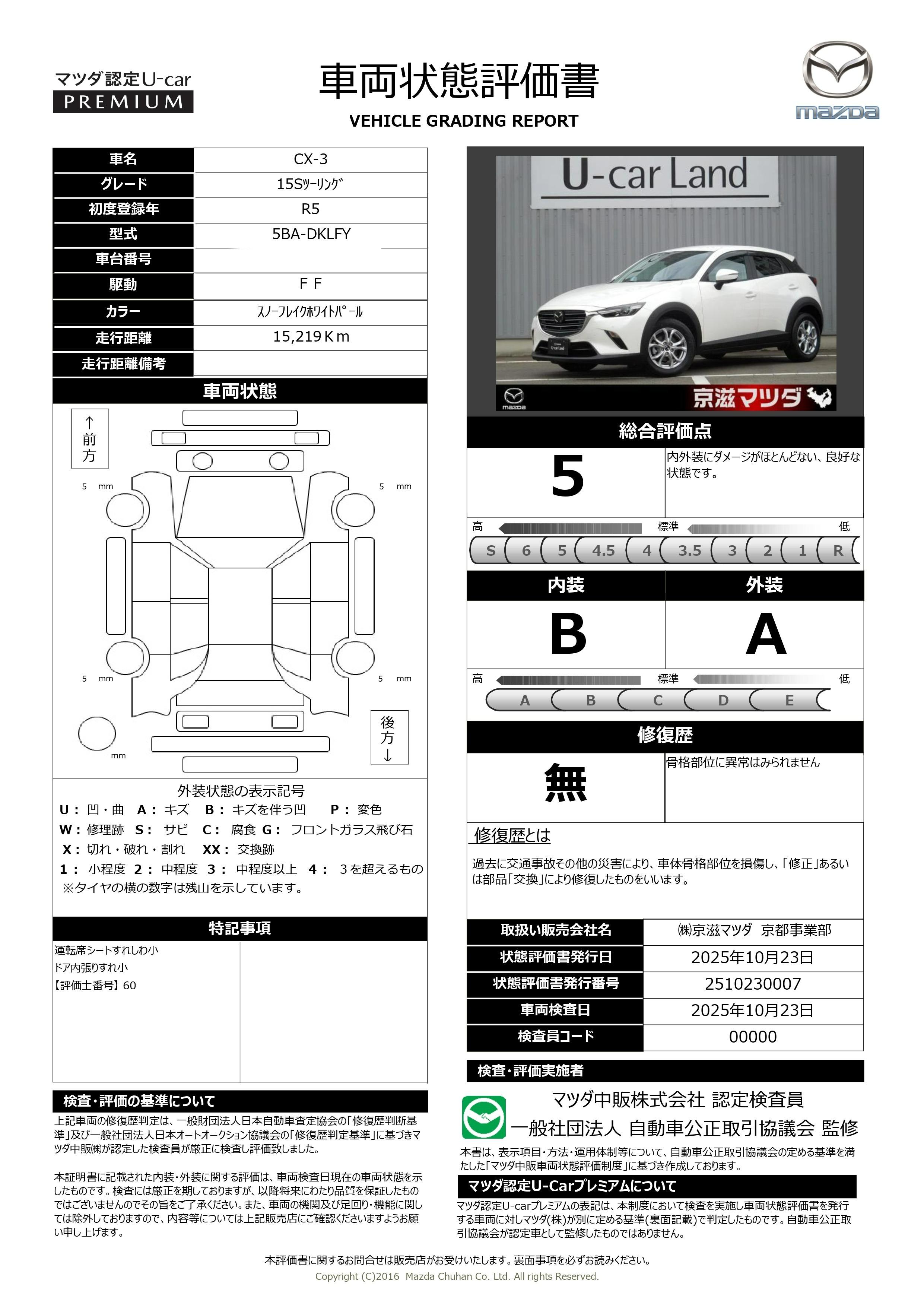 | 保証修理受付先 | 先ずは当店にご連絡ください。全国約800か所のマツダサービス工場で保証修理が可能ですので、旅先やお引越し先でのトラブルもご安心下さい。※マツダブランド車以外は当社のみ対応可能。詳しくはスタッフまで。 |