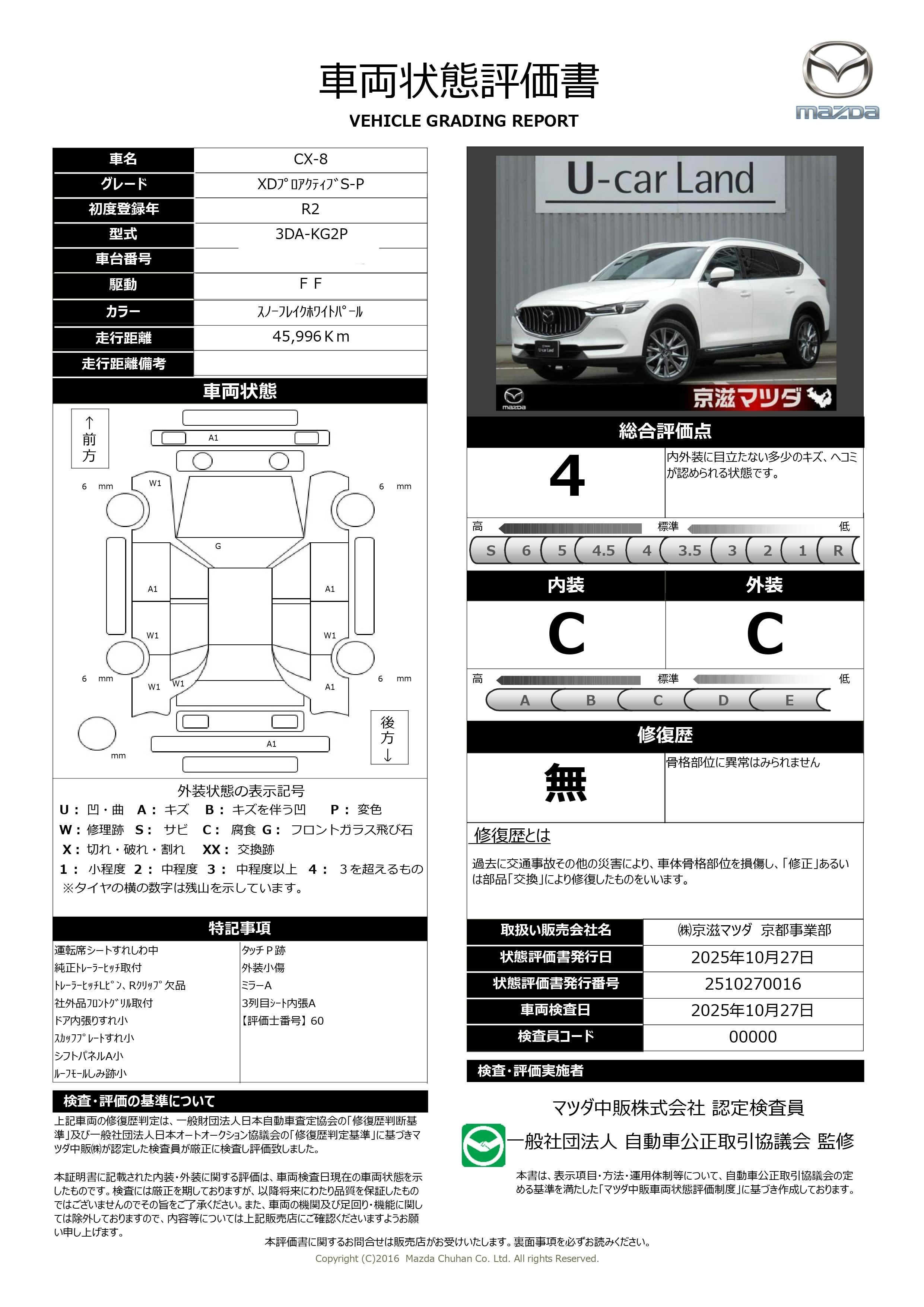 | 保証について | [保証付]:12ヶ月・走行無制限 マツダの店舗にてご購入頂いたお車に、無料でご提供している納車日より1年間・走行無制限の{さわやか保証}が付いております。別途有償で{さわやかプラス}にご加入頂くと、最大3年間の保証サービスが可能です。 |
