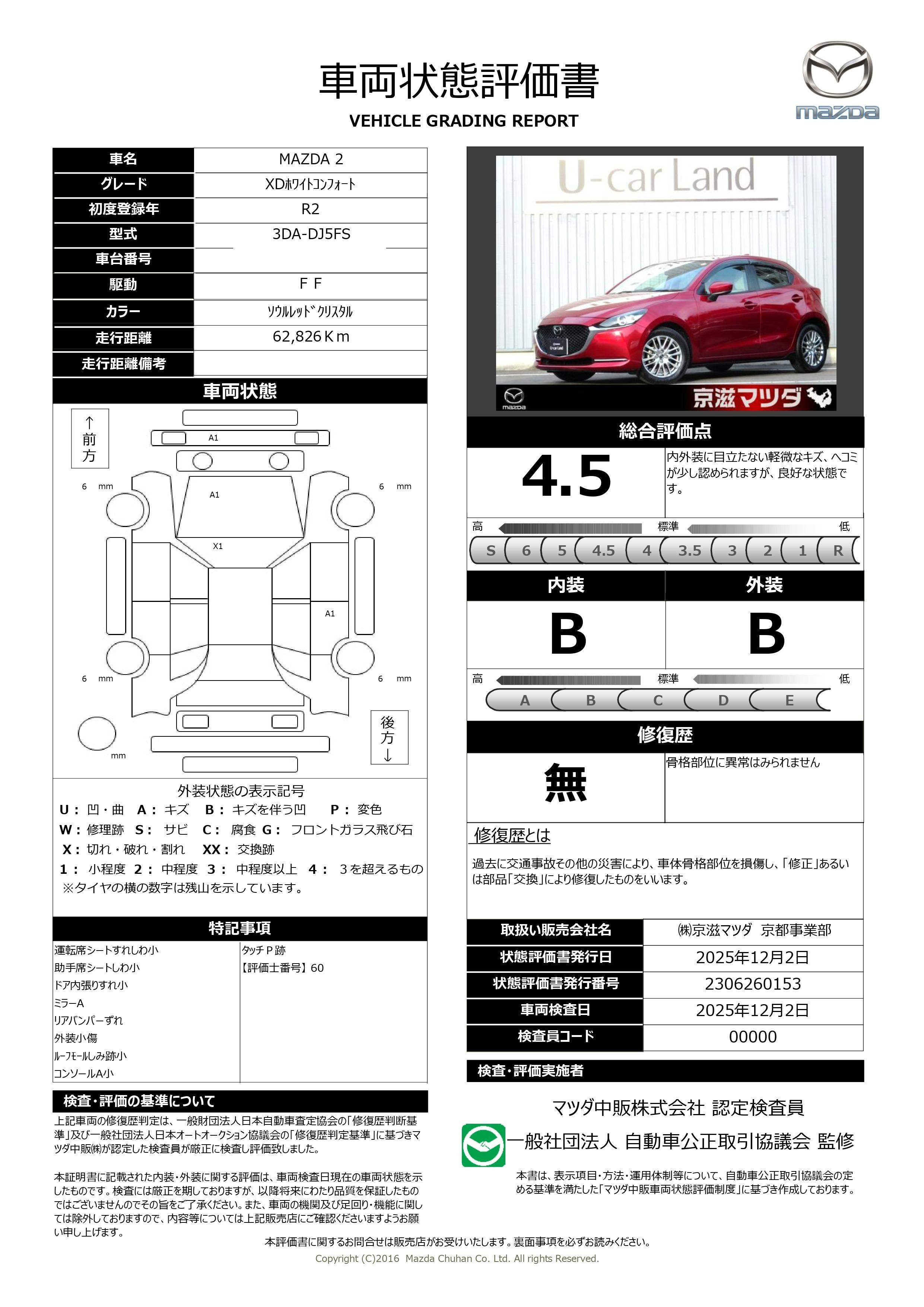 [保証付]:12ヶ月・走行無制限 マツダの店舗にてご購入頂いたお車に、無料でご提供している納車日より1年間・走行無制限の{さわやか保証}が付いております。別途有償で{さわやかプラス}にご加入頂くと、最大3年間の保証サービスが可能です。 |