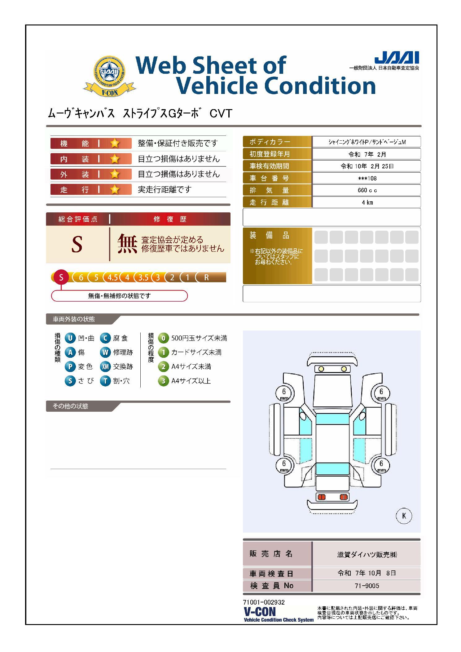 クルマの状態と評価点数を開示し、図解で表示いたしております。車両状態検査書はこちらの車両ページで閲覧できます。(※一部評価書が未設置の車両がある場合がございます) 74