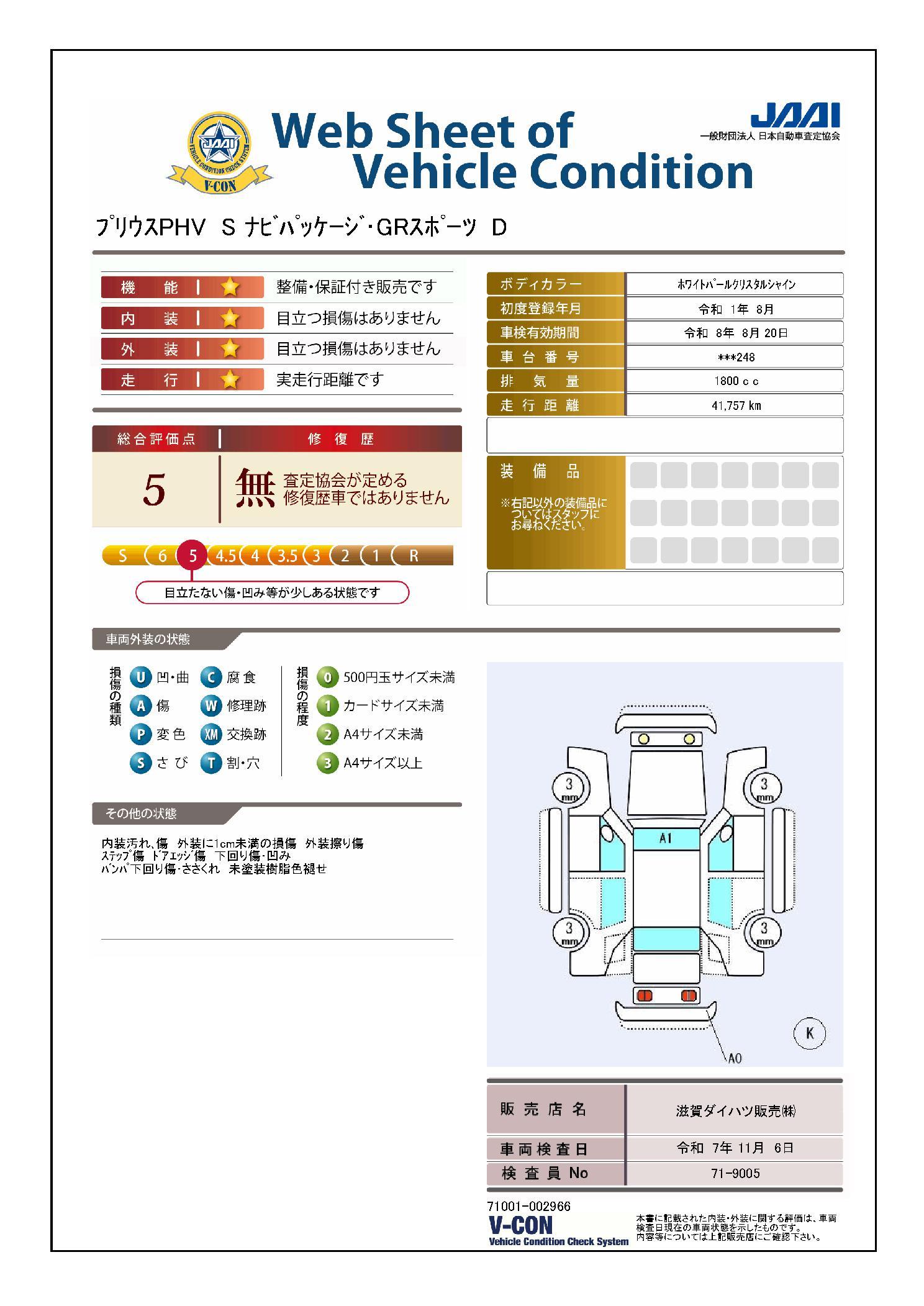 | 保証項目 | 新車メーカー保証に準じた保証(エンジン・エアコン・トランスミッション他)を1年間(走行距離無制限)無償で受けられます。 |