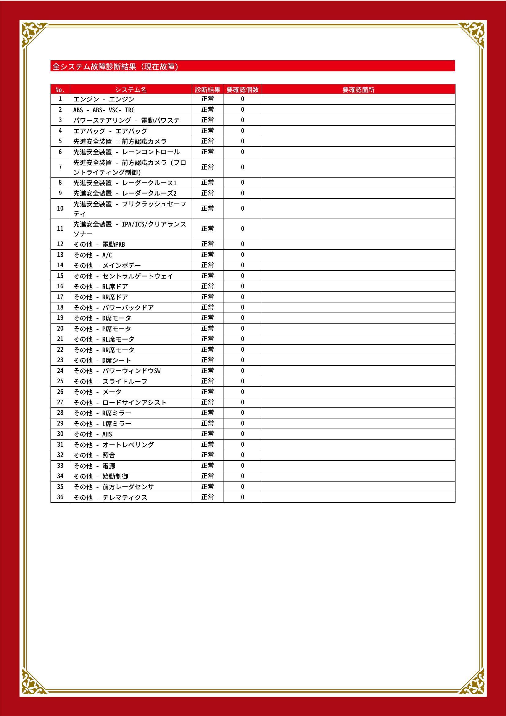 | 保証項目 | 3ヶ月・3000km以内ならエンジン、トランスミッション、ハイブリッド、ステアリング、ブレーキの各機構における主要項目を無償修理(または交換)いたします。 |