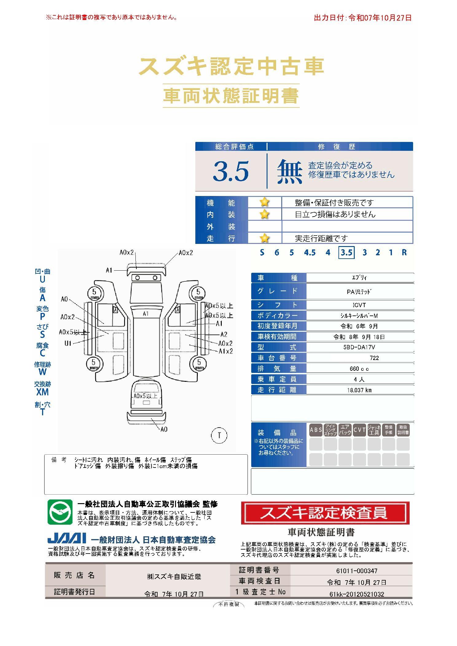 | 保証について | [保証付]:2027(令和9)年9月まで・60000km ※いずれか早い時期が保証適用の条件となります。 |
