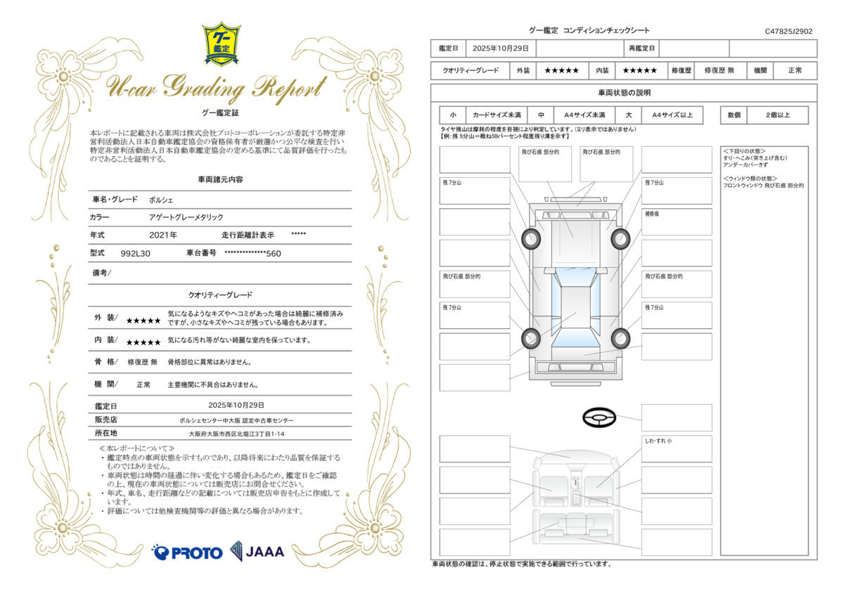 | 保証について | [保証付]:2027(令和9)年9月まで・走行無制限 世界統一基準の保証内容にてサポート致します。別途ご費用が必要となりますが初年度登録日より最長14年目まで保証を延長頂くことも可能です。また万が一のトラブルにも安心のサービス《ポルシェアシスタンス》が1 |