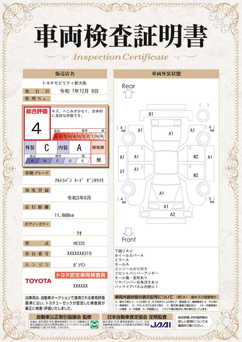 | 保証修理受付先 | トヨタカローラ新大阪の各テクノショップまたは全国のトヨタ販売店テクノショップになります。詳しくは担当スタッフまでお問い合わせください。 |