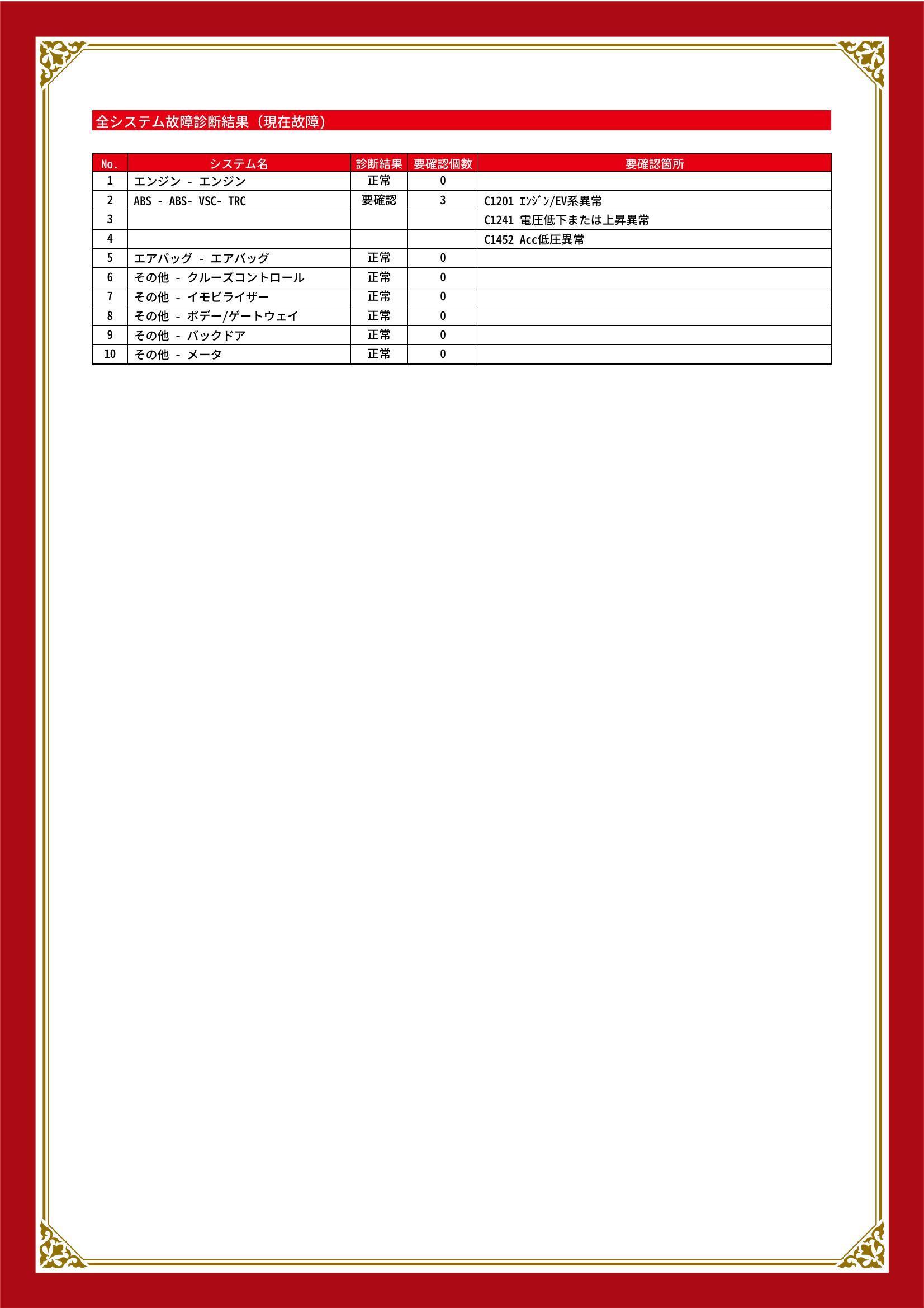 | 保証項目 | 消耗品、内外装部品を除く機能部品をすべて保証いたします。詳しくはお問い合わせください。 |