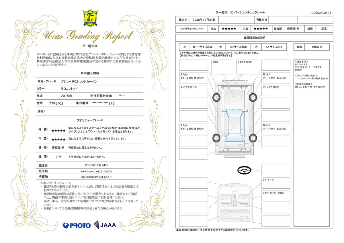 | 保証項目 | 保証対象範囲は、道路運送車両第48条に基づく定期点検整備時に同法に基づく自動車点検基準に定められた項目について行った点検・整備作業とします。詳しくはお気軽にお尋ねください |