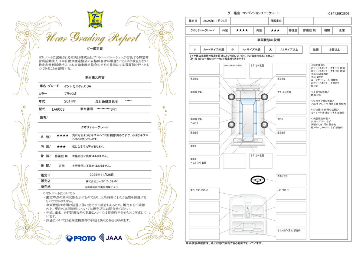 当店はGOO鑑定加盟店となっております!!Goo鑑定とは、お客様に代わってプロの鑑定師が中古車の車両状態を鑑定するサービスです。第三者機関のプロの鑑定師により最大344項目におよぶチェックを行い、公正にグレードを定めます。外装・内装・エンジン・修復歴の検査を実施しております!!