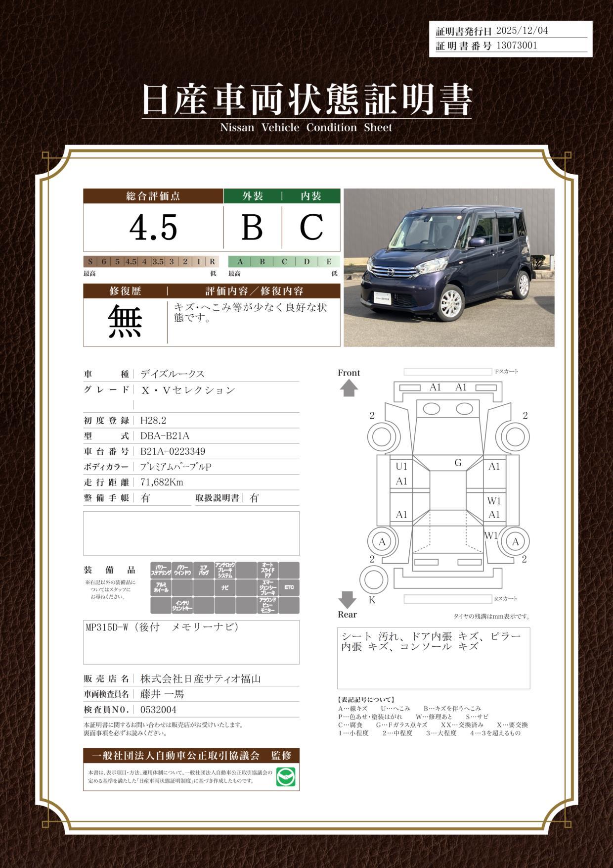 《日産認定中古車》 専門スタッフが検査し認定した車両です。保証期間は12ヶ月間、全国の日産ディーラーで対応が可能です。オプション装着部品に関してはメーカー純正部品も対象です。 4