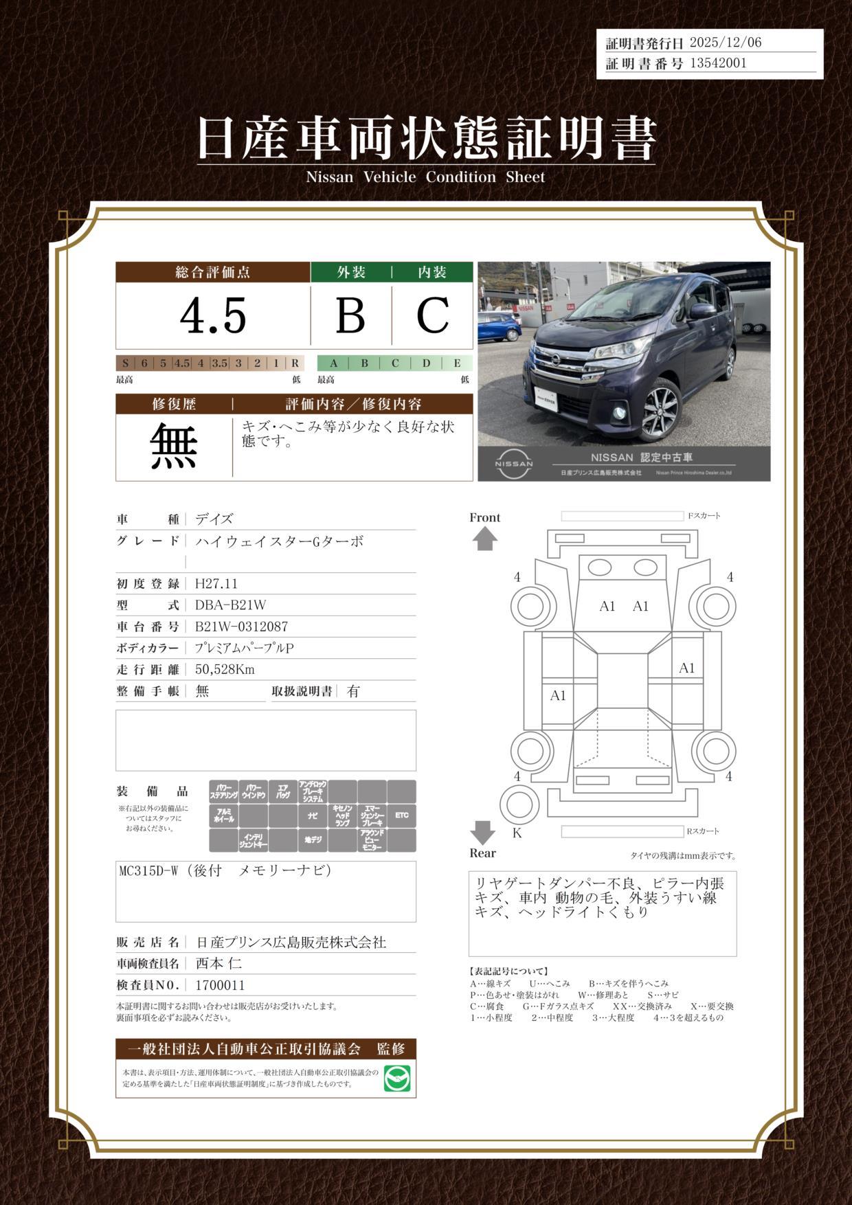 日産 デイズ ハイウェイスター Gターボ 660 ハイウェイスターGターボ 自社下取車 純正ナビ 地デジ ETC