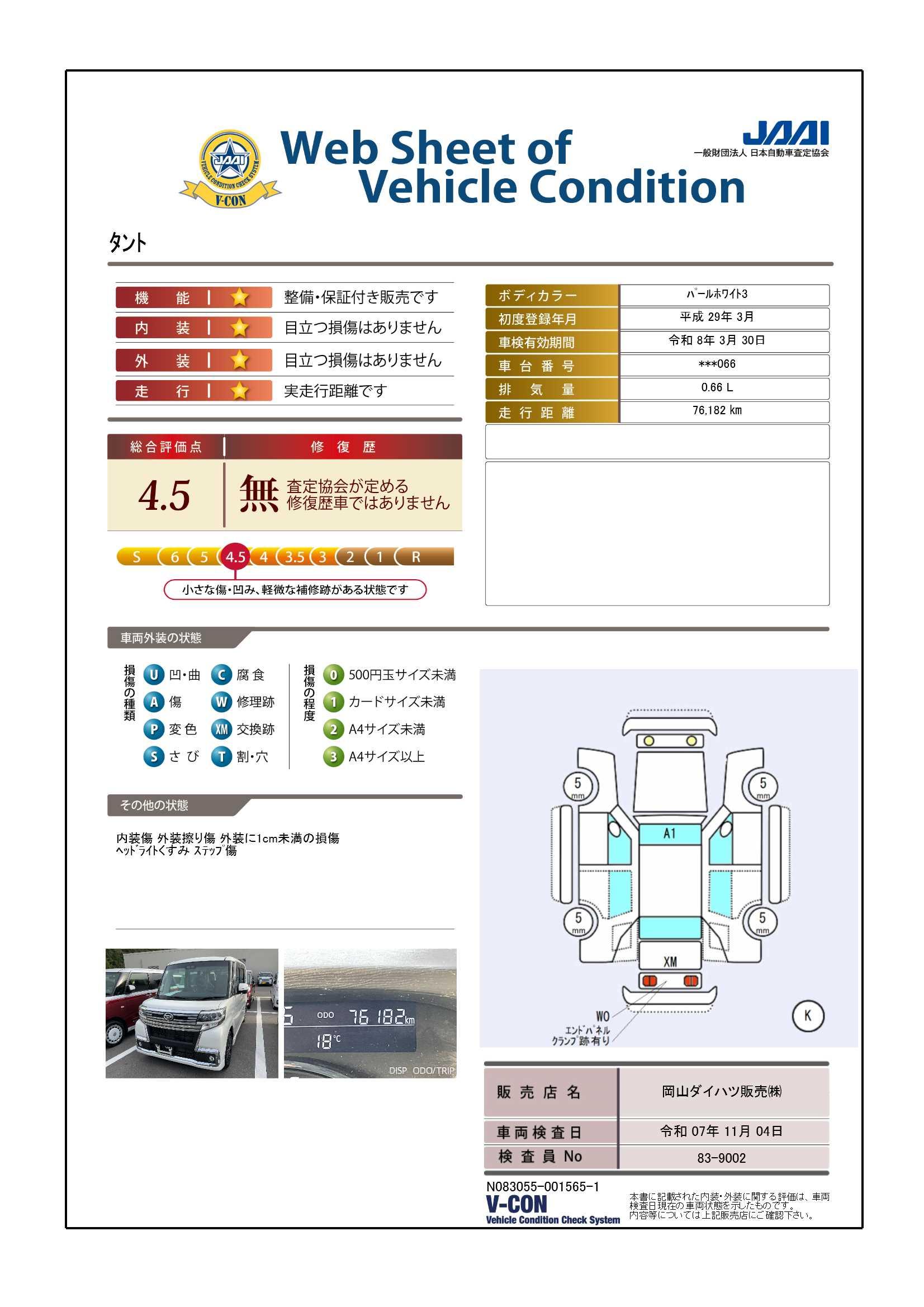 | 保証項目 | 新車メーカー保証に準じた保証(エンジン・エアコン・トランスミッション他)を1年間無償で受けられます。さらに、別途有償保証の「まごころ保証プラス」「まごころ保証プラスα」をご用意しております。 |