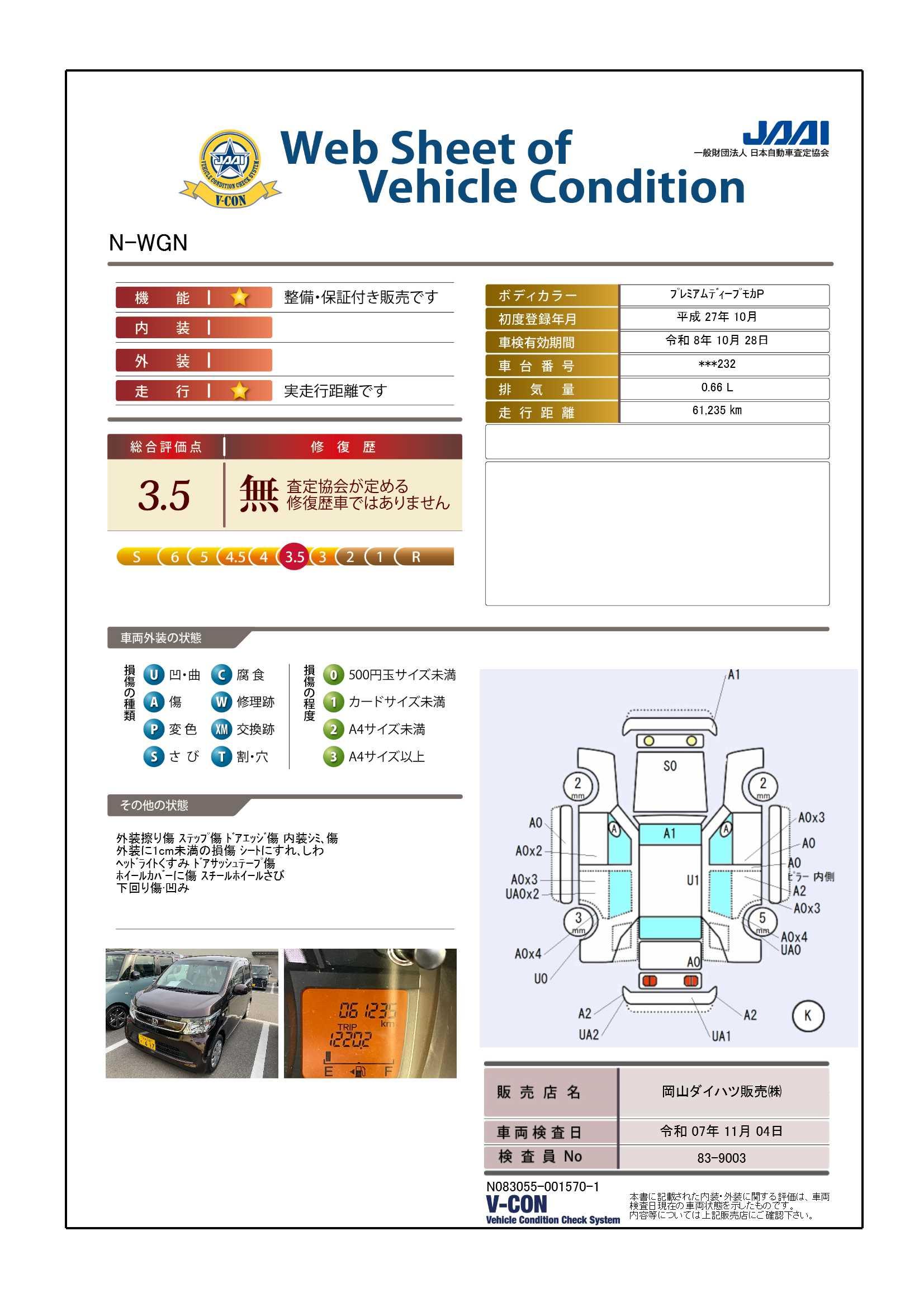| 保証項目 | 新車メーカー保証に準じた保証(エンジン・エアコン・トランスミッション他)を1年間無償で受けられます。さらに、別途有償保証の「まごころ保証プラス」「まごころ保証プラスα」をご用意しております。 |