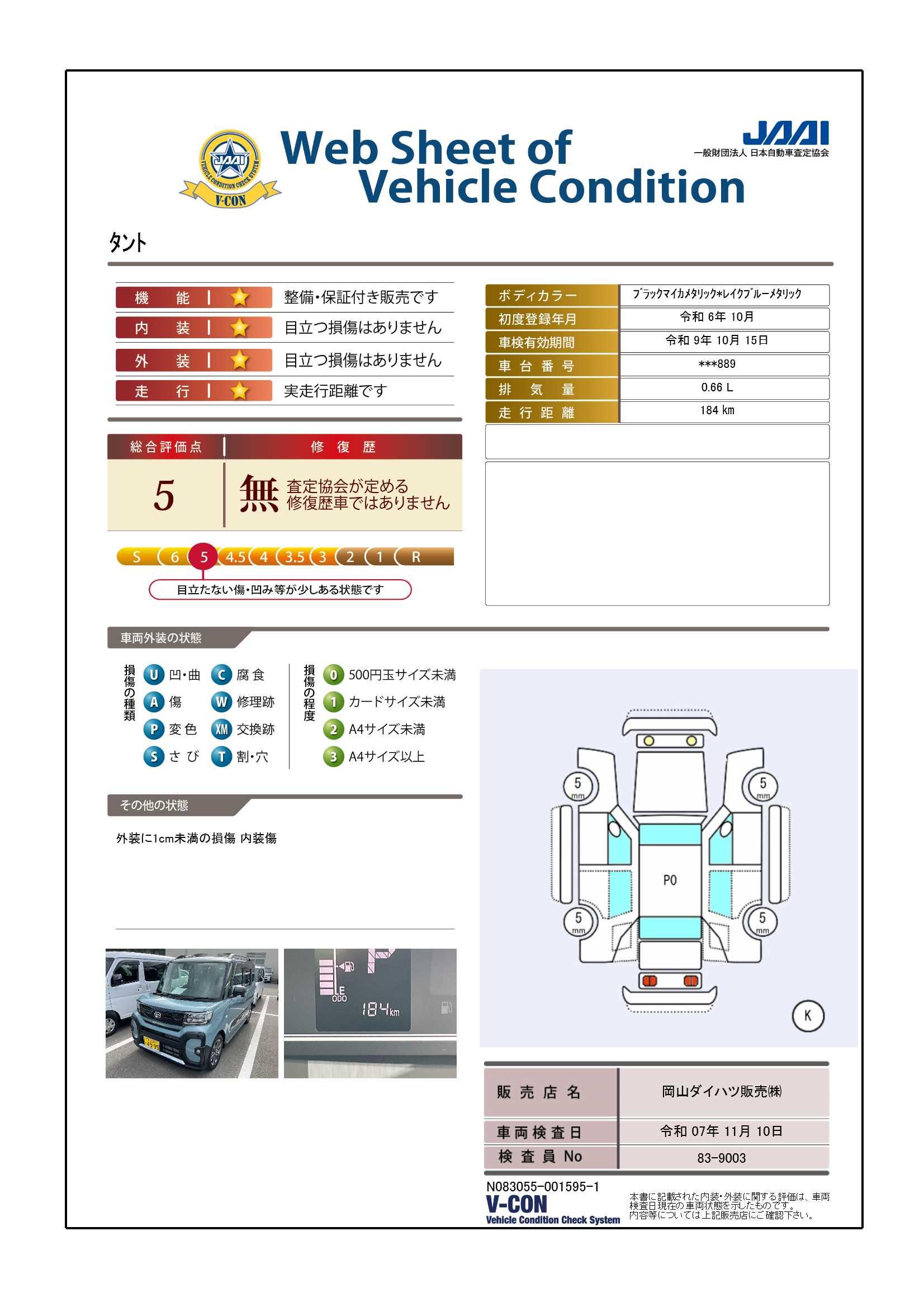 | 保証修理受付先 | 岡山ダイハツのご購入店舗までご連絡ください。全国約700か所のダイハツのお店で、新車同等レベルの保証修理が受けられます。お引越し先や旅先でのトラブルにも、近くのダイハツのお店が対応いたします。 |