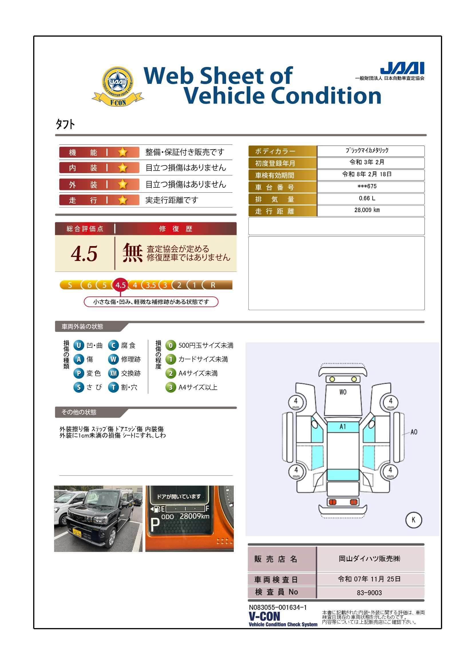 | 保証項目 | 新車メーカー保証に準じた保証(エンジン・エアコン・トランスミッション他)を1年間無償で受けられます。さらに、別途有償保証の「まごころ保証プラス」「まごころ保証プラスα」をご用意しております。 |