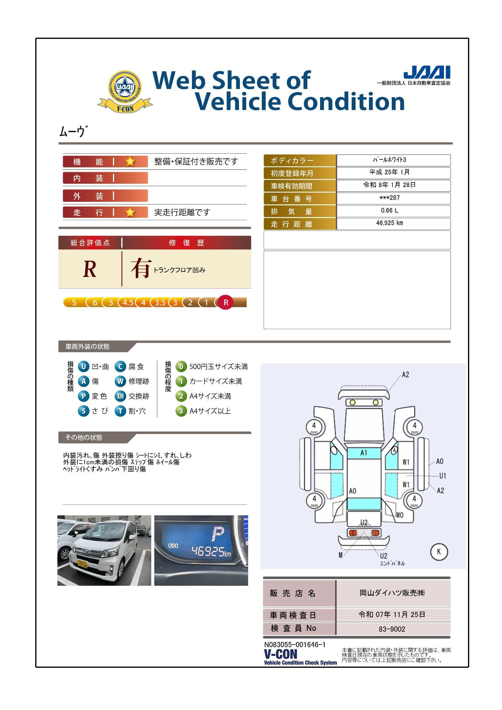 ダイハツ認定中古車は、「車両状態証明書」「約60項目の徹底点検・整備」「内装の徹底清掃と洗浄」「1年間無償保証(車両本体価格30万円以下の車両は3ヶ月または3000kmの保証)」が全車に付いています。 18