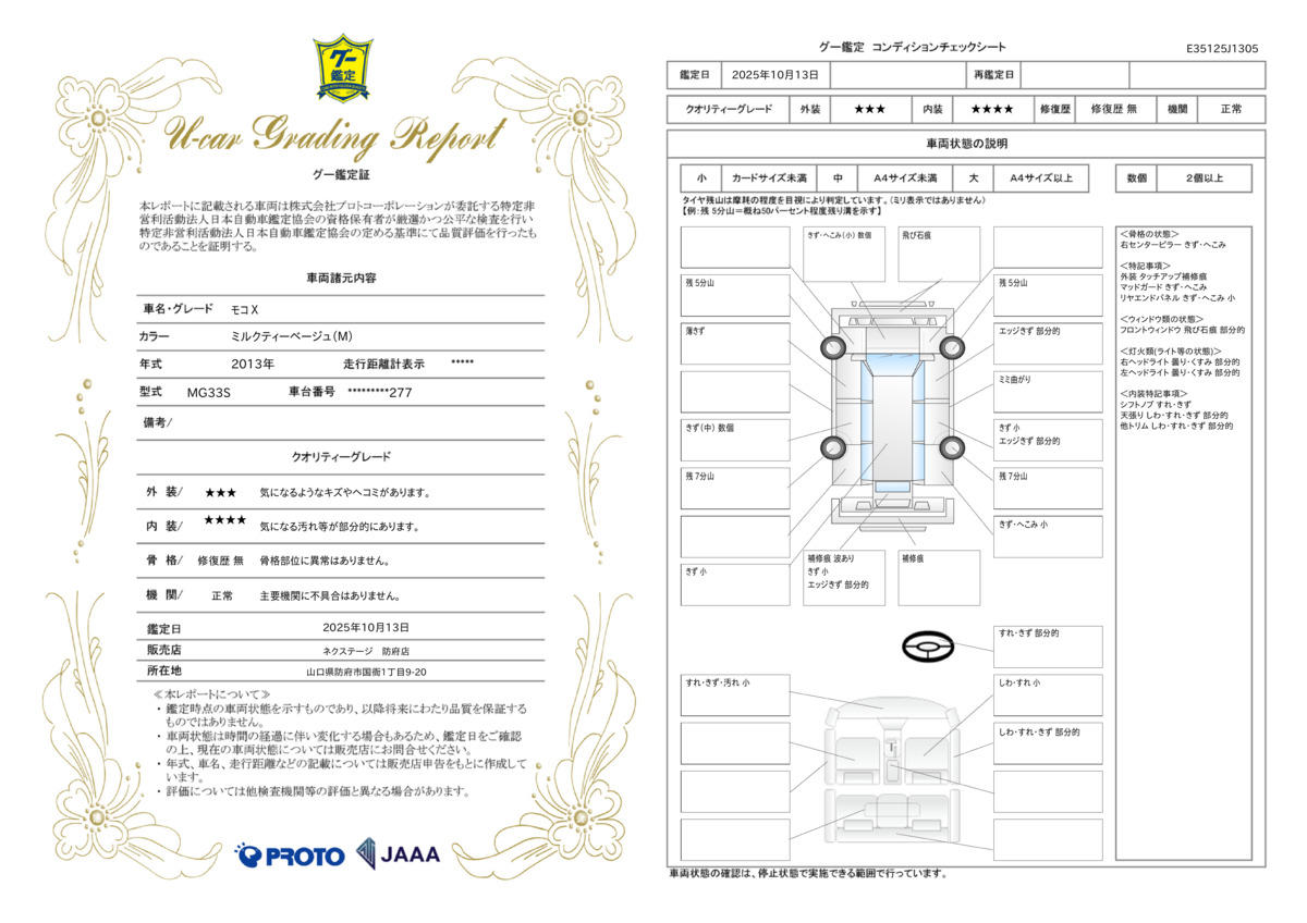 弊社では、全車『修復歴なし』のお車のみ取り扱っております。専任バイヤーによる厳選した仕入れの後、入庫後の車両チェックを行い、ネクステージが認定した高品質な中古車をご提供しております。 14