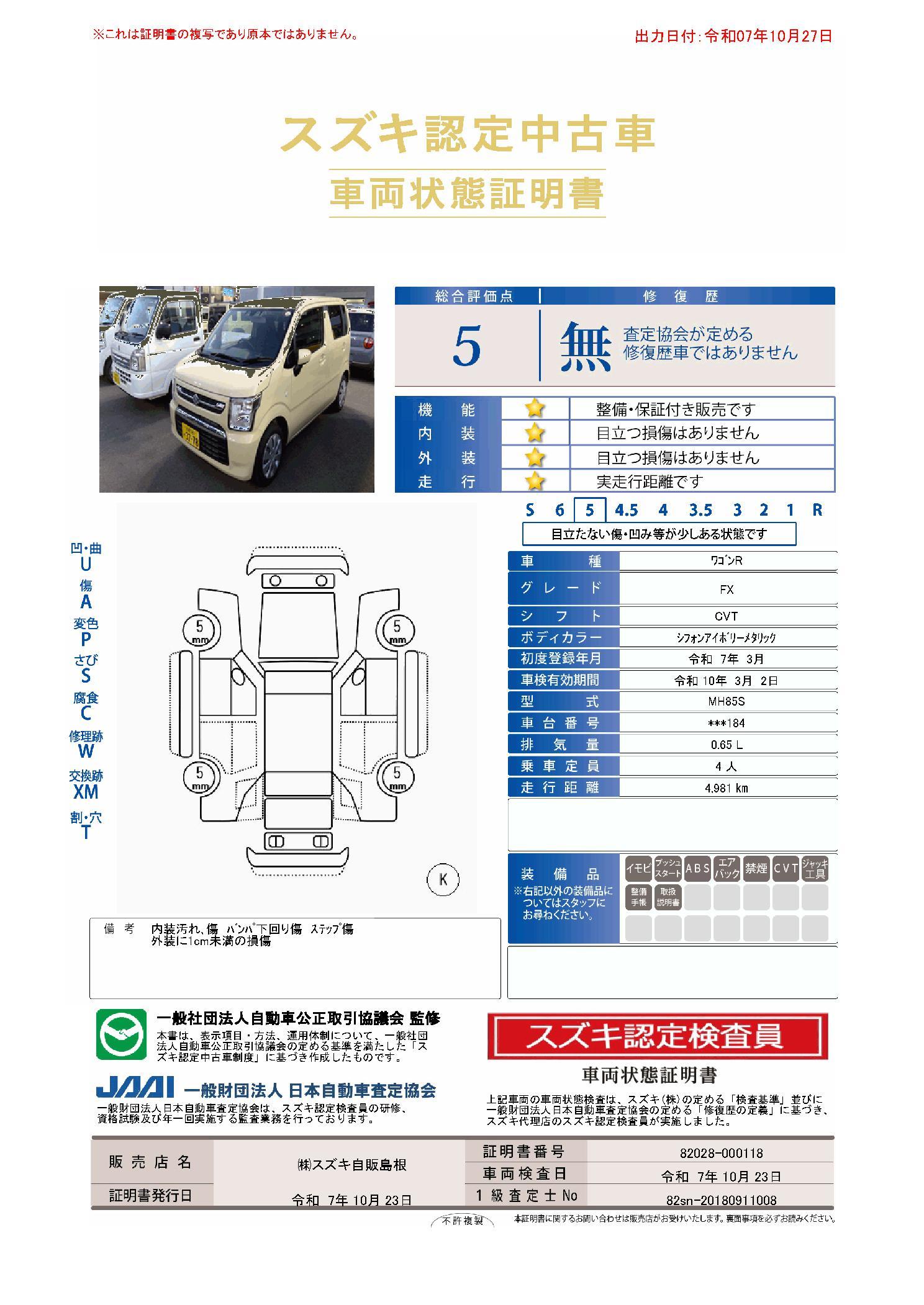 | 保証について | [保証付]:2028(令和10)年3月まで・60000km ※いずれか早い時期が保証適用の条件となります。 |