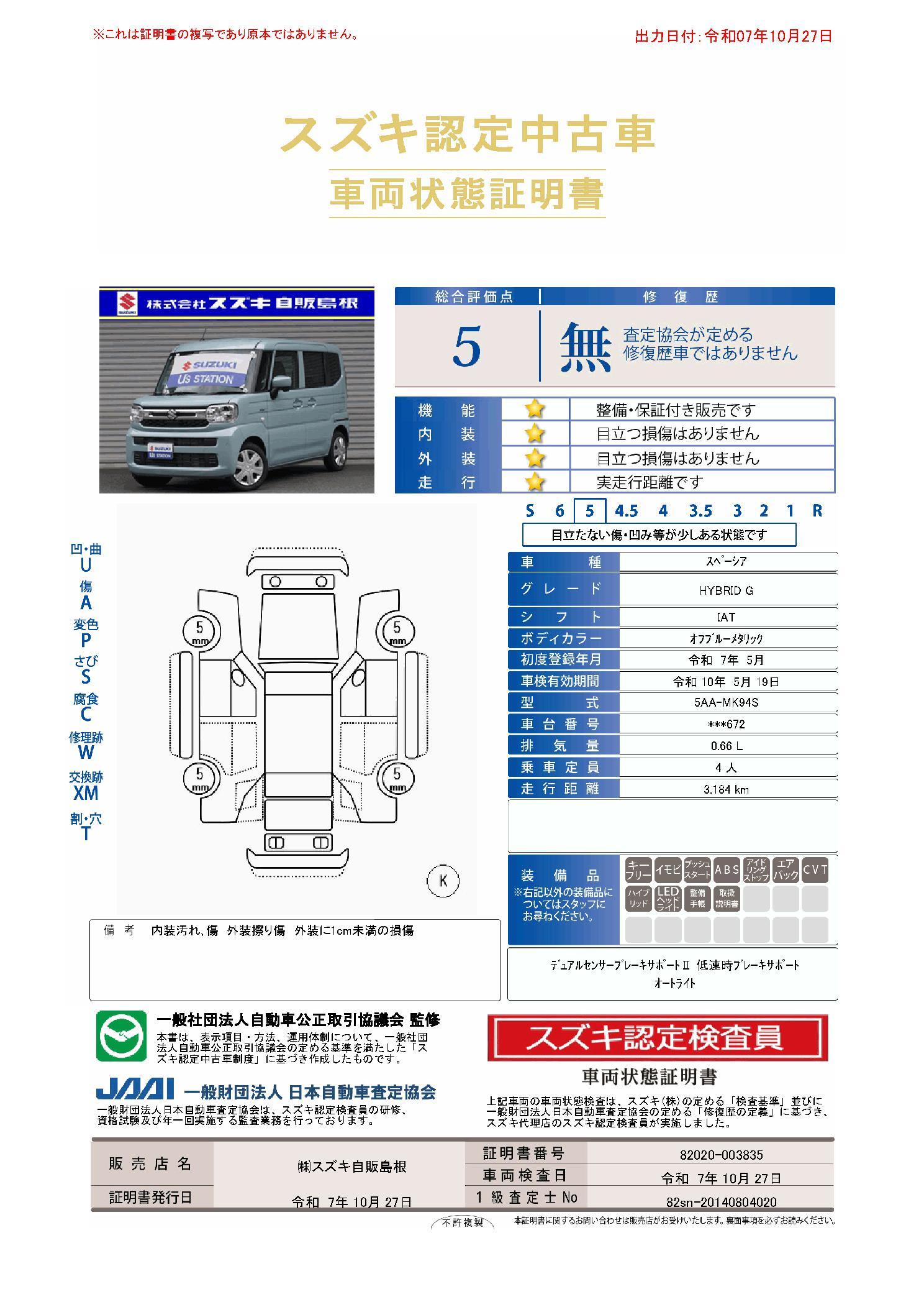 | 保証について | [保証付]:2028(令和10)年5月まで・60000km ※いずれか早い時期が保証適用の条件となります。 |